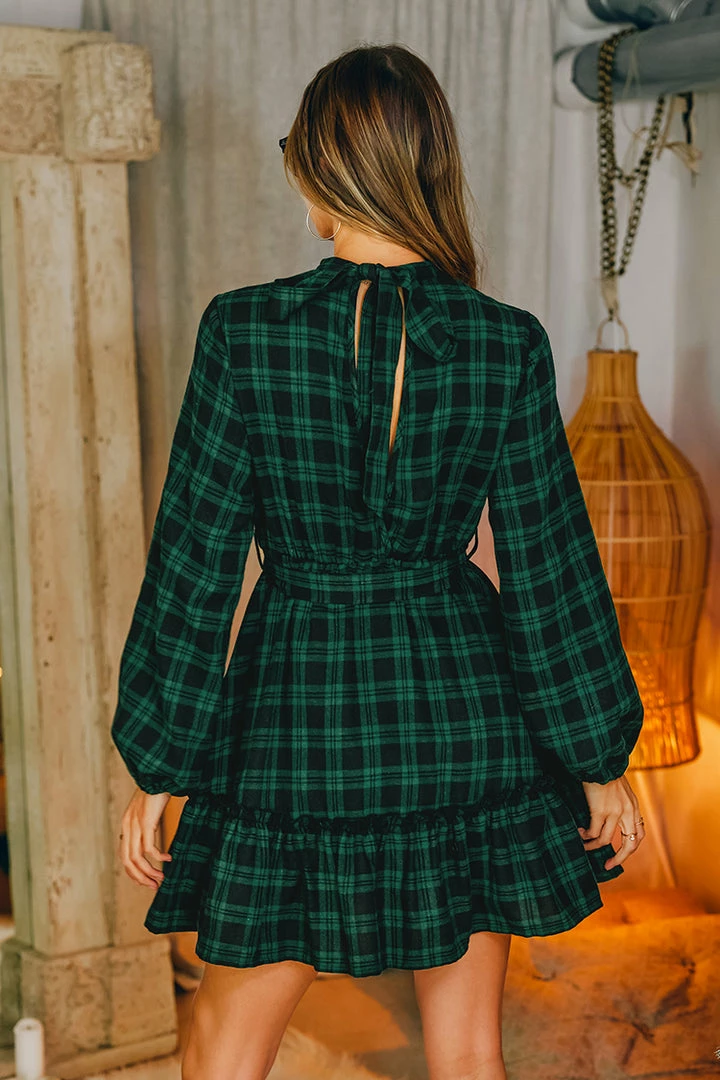 This mini dress screams fall! Featuring a plaid pattern, mock neck, self-tie sash belt, long peasant sleeves, a flounce hem, and A-line silhouette.
