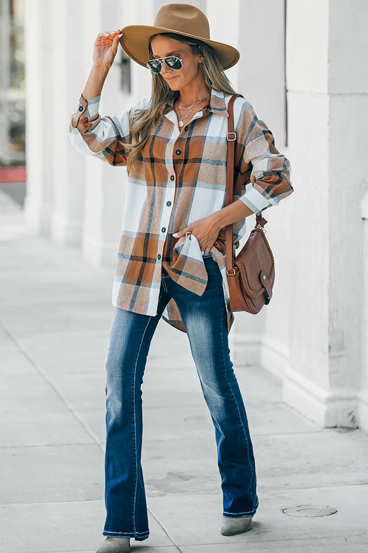 We are getting major autumn vibes from this oversized shirt featuring a plaid pattern, basic collar, button-front closures, dropped long sleeves, and a dolphin hem.ย