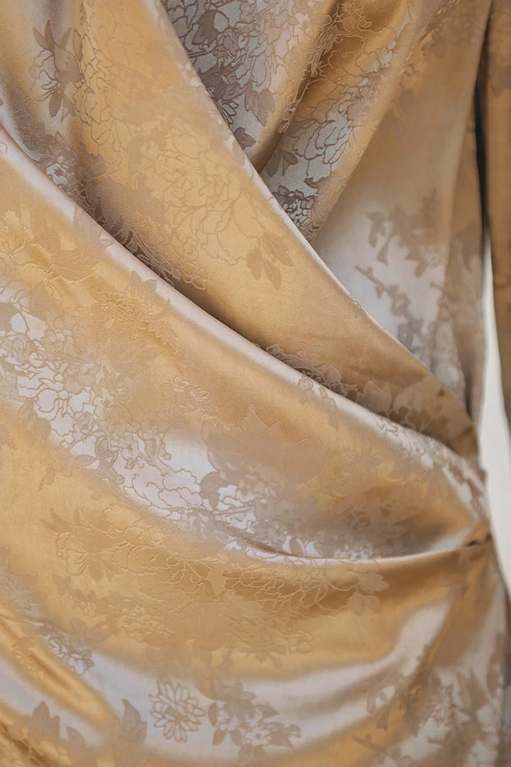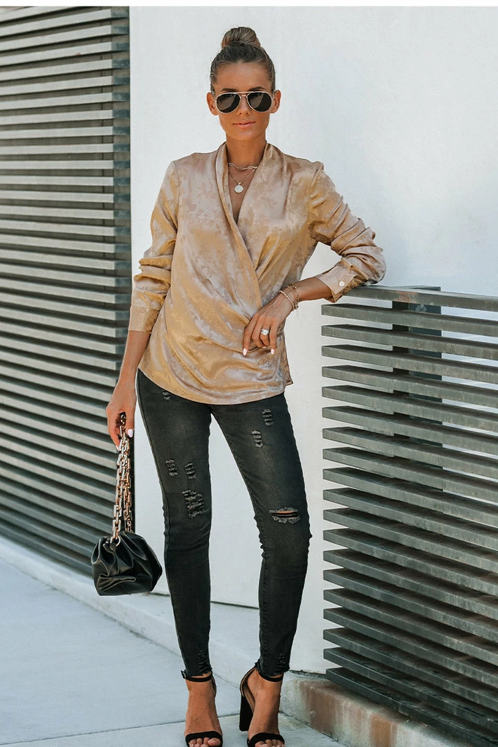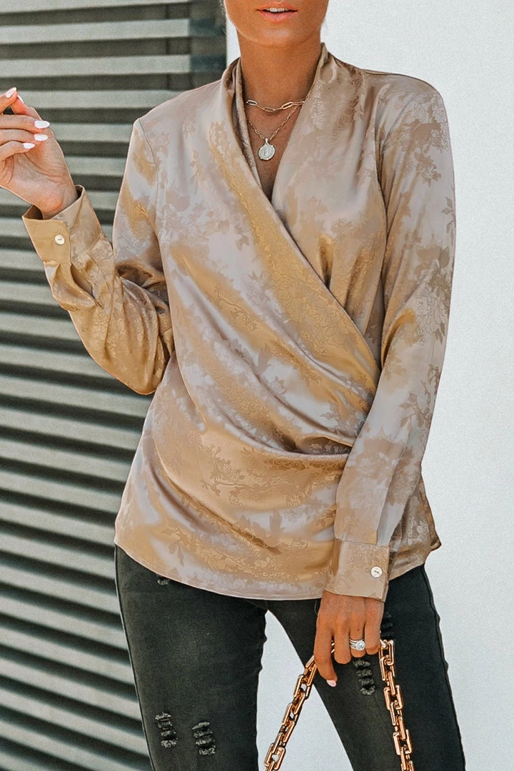 Elevate your office wardrobe in this satin top featuring an allover shadow floral print, draped surplice neckline, wrap design, and long sleeves. Complete the look with trousers and slip-on heels.ย