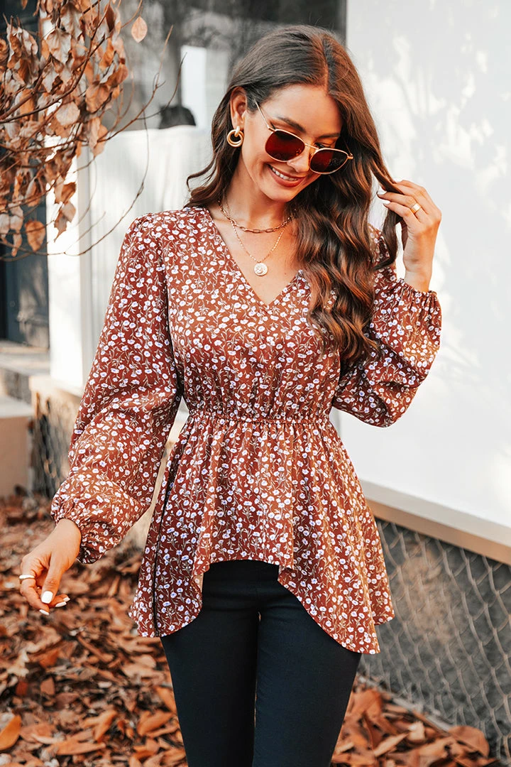 This woven top will surely steal your heart! Featuring a ditsy floral print, V-neckline, long peasant sleeves, an elasticized waist, and asymmetrical flounce hem.