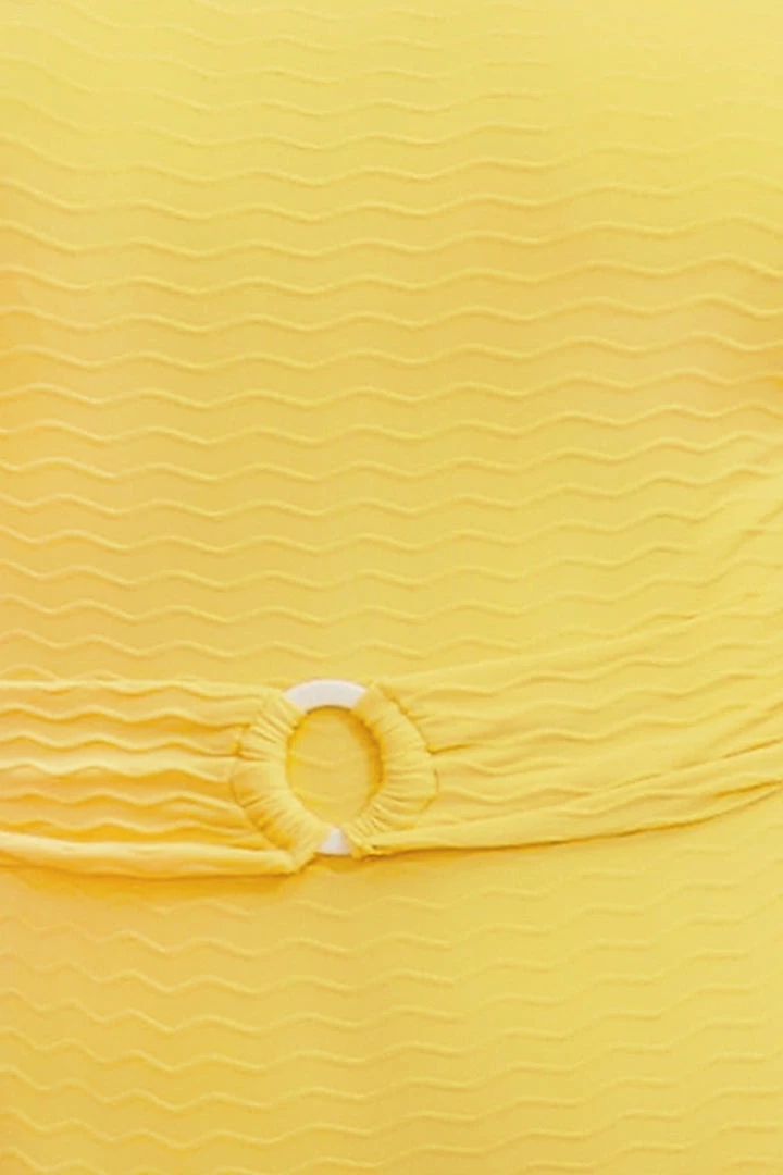 Shine like the sun in this one-piece swimsuit featuring an allover textured design, straight neckline, belted accent with O-ring buckle, adjustable cami straps, and a high-leg cut.ย ย