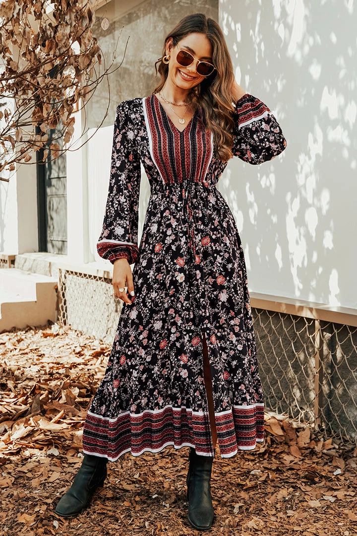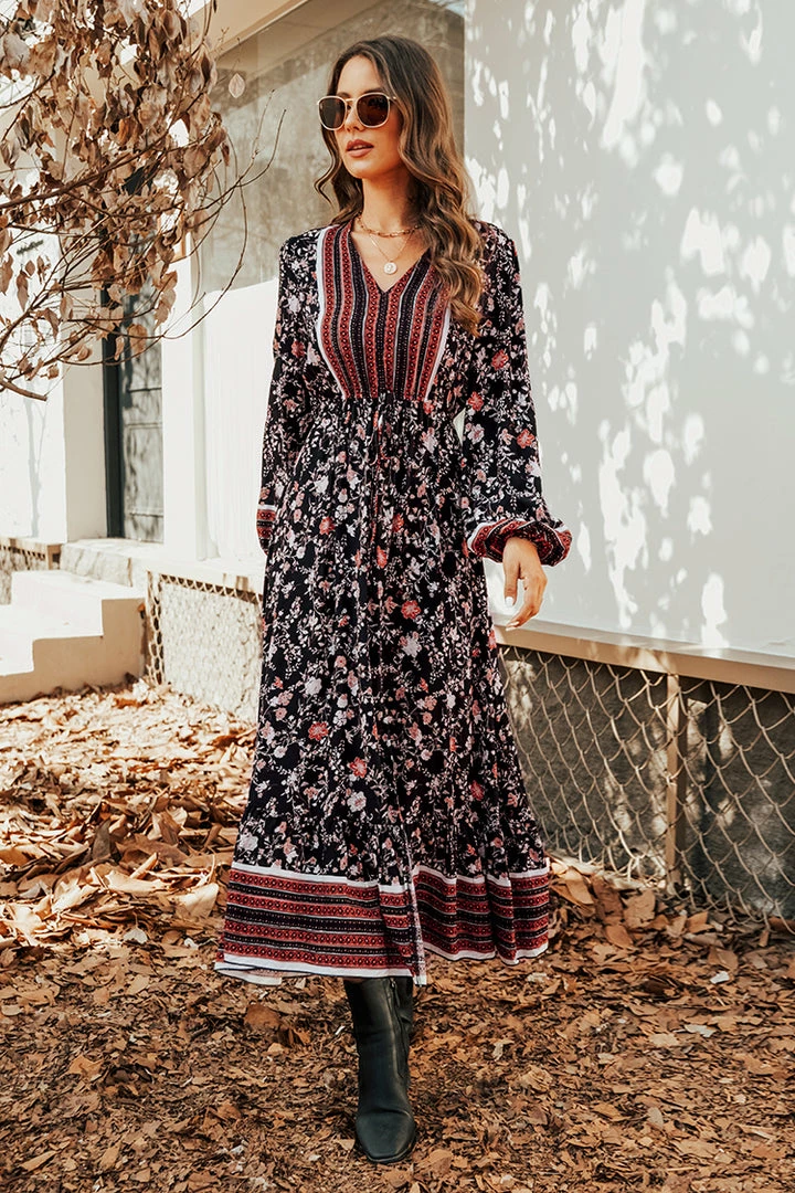 We are getting major retro vibes from this woven maxi dress featuring a paisley floral print, V-neckline, elasticized waist, long peasant sleeves, and a column silhouette.