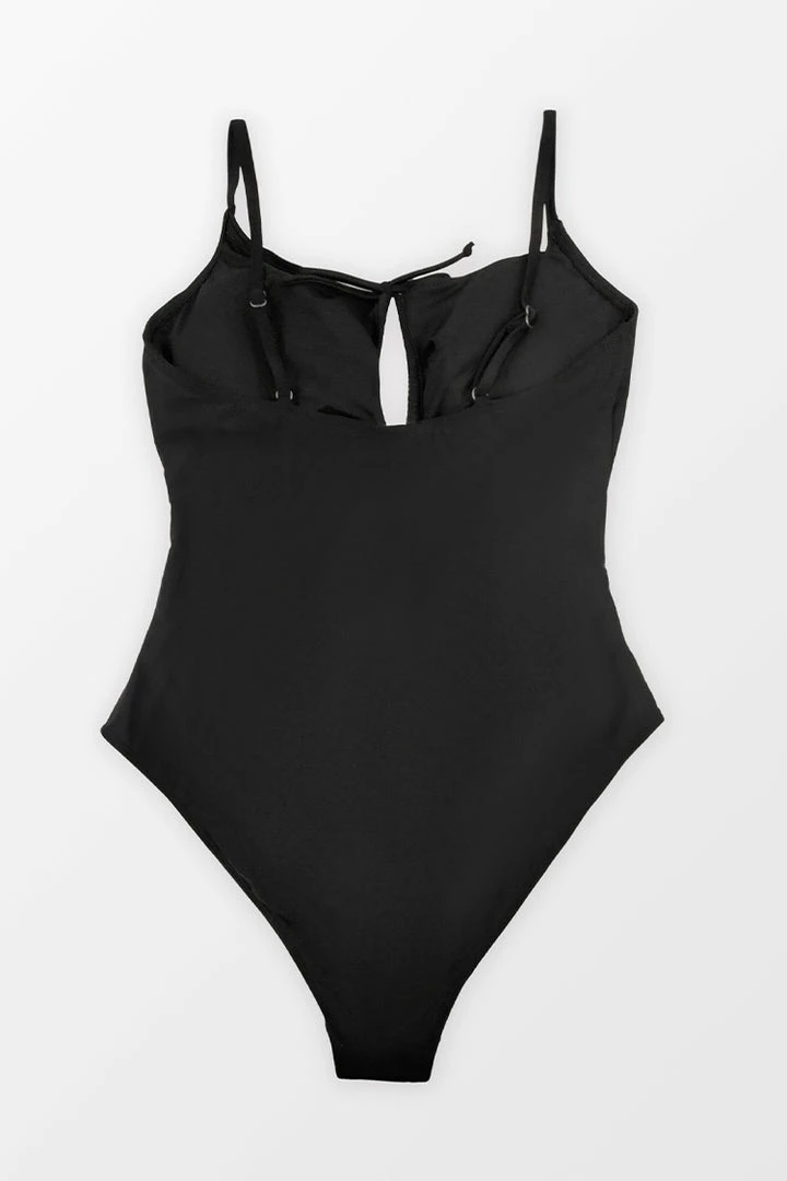 We are totally obsessed over this one-piece swimsuit featuring a scoop neck with self-tie accent, front cutouts, adjustable cami straps, and classic bum coverage.