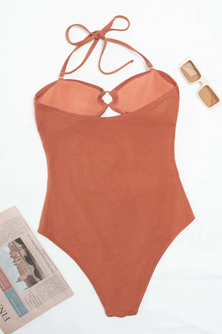 Make a bold statement with our Brook O-ring Halter Cut-out One Piece Swimsuit. This flirty one-piece features halter design with o-ring and cut-out front. It’s the perfect one piece for the summer.