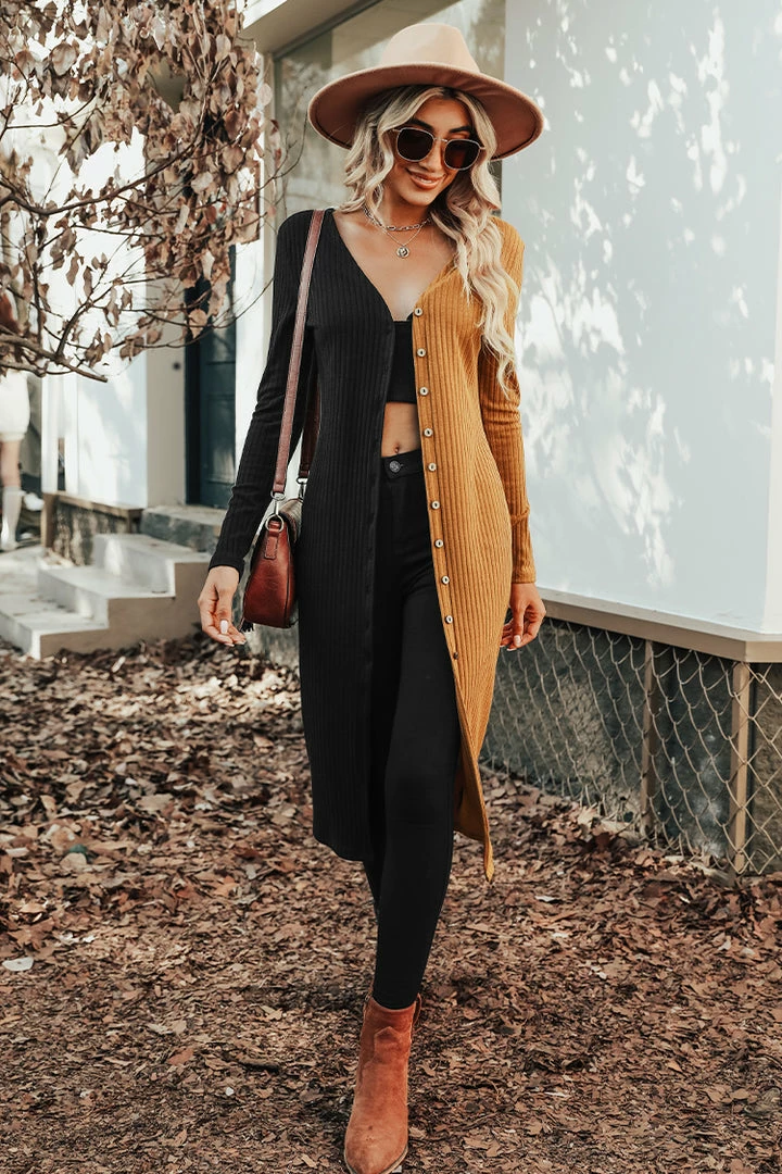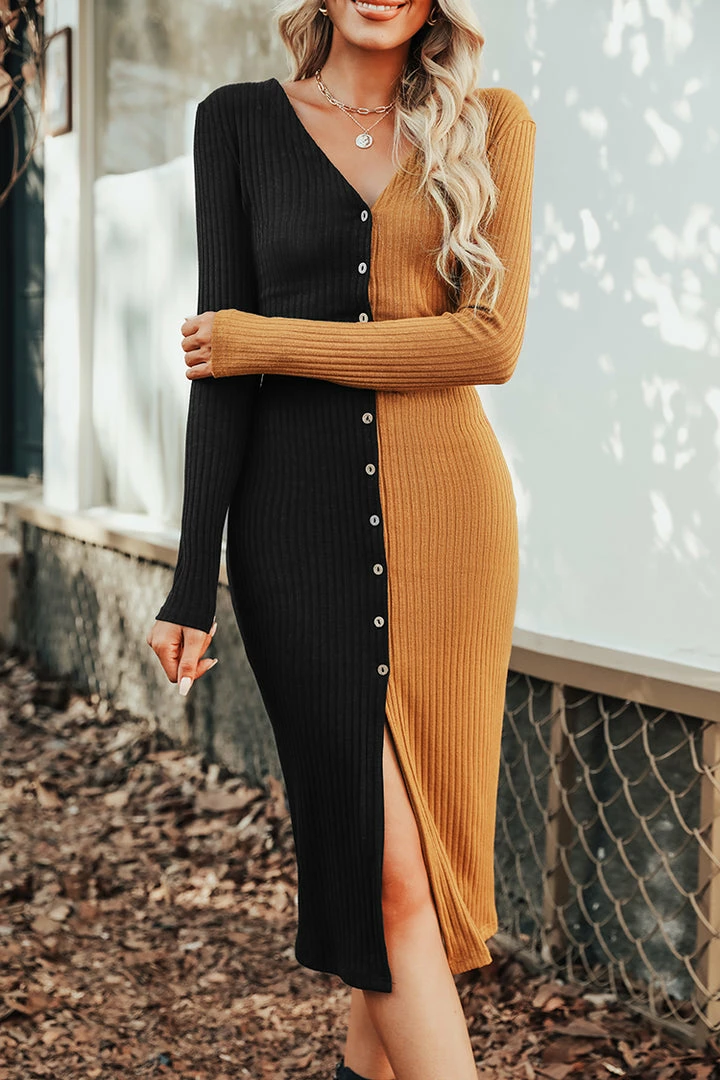 Cozy looks good on you and so does this ribbed knit midi dress featuring a two-tone design, V-neckline, button-front closures, and long sleeves.