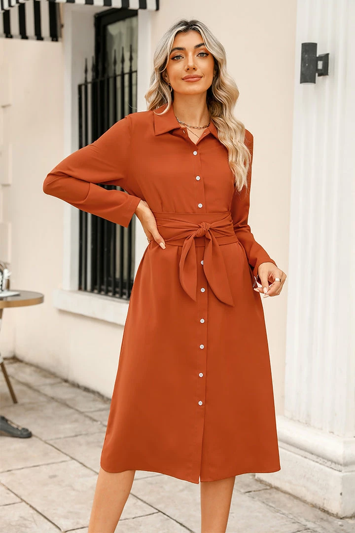 Make a statement in this shirt dress featuring a basic collar, self-tie sash belt, button-front closures, long sleeves, and a maxi length.