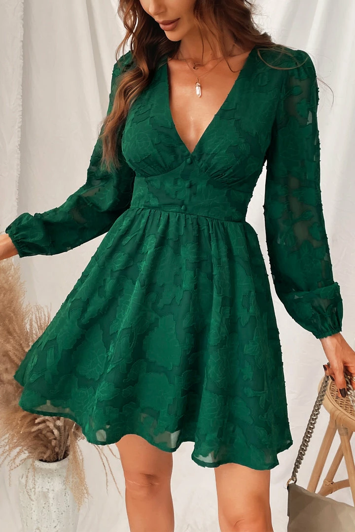 Get ready to steal the show in this woven mini dress featuring an allover floral shadow print, plunging V-neckline, semi-sheer long peasant sleeves, mock button closures, partial lining, and an A-line silhouette.ย
