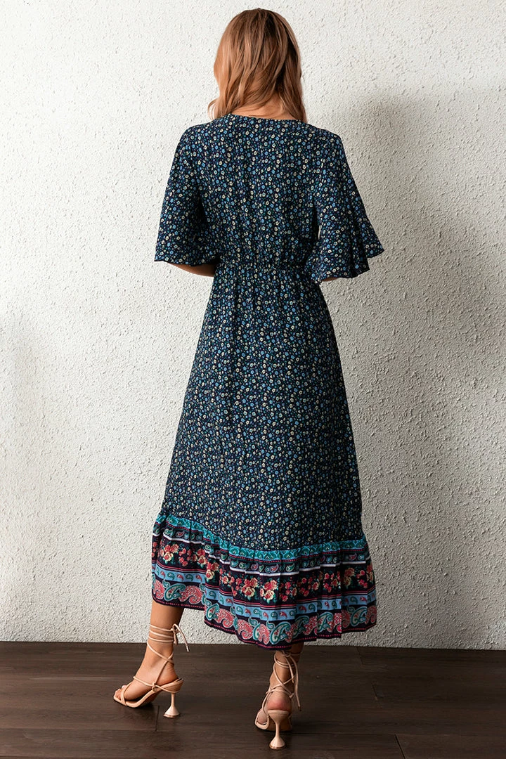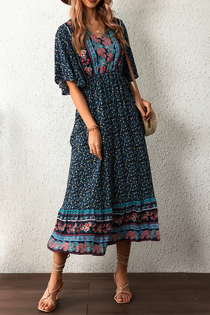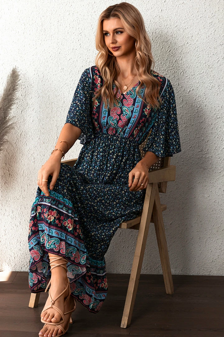 Become a boho beauty in this woven maxi dress featuring a paisley floral print, V-neckline, elasticized waist, ยพ sleeves, and an A-line silhouette.