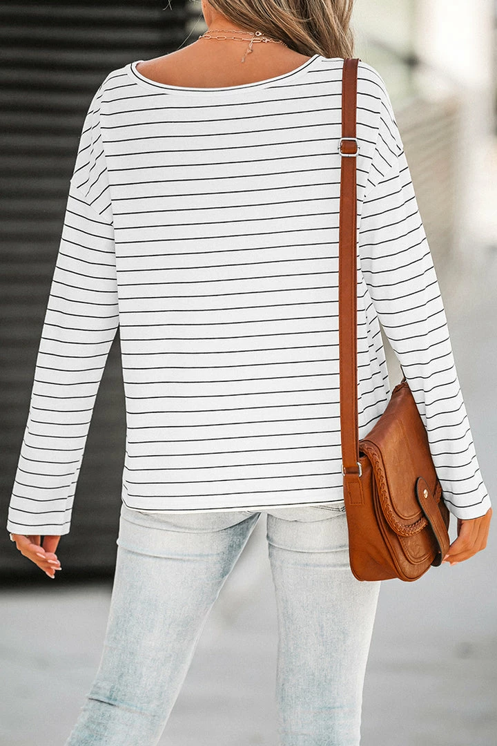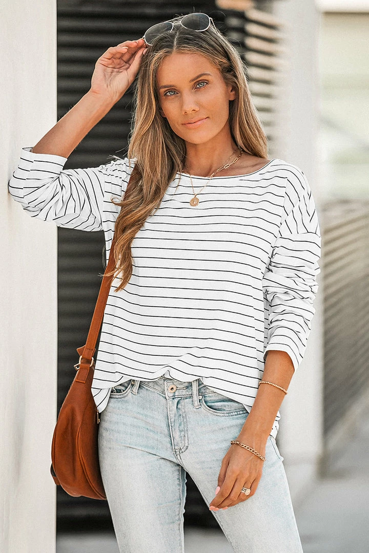 Get cozy in the colder months in this tee featuring a striped pattern, round neckline, dropped long sleeves, and a relaxed fit.