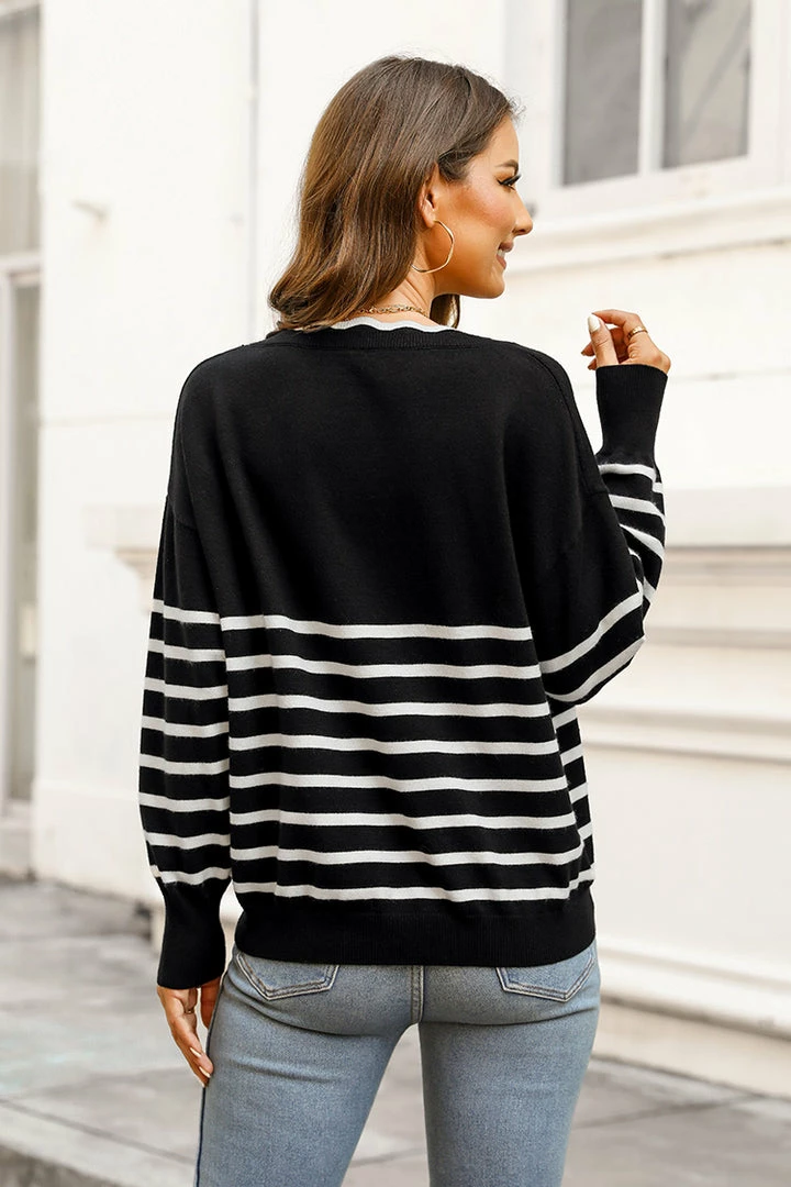 Cuddle on up in this knit sweater featuring a striped pattern, V-neckline with scalloped trim, dropped long sleeves, and ribbed trim.