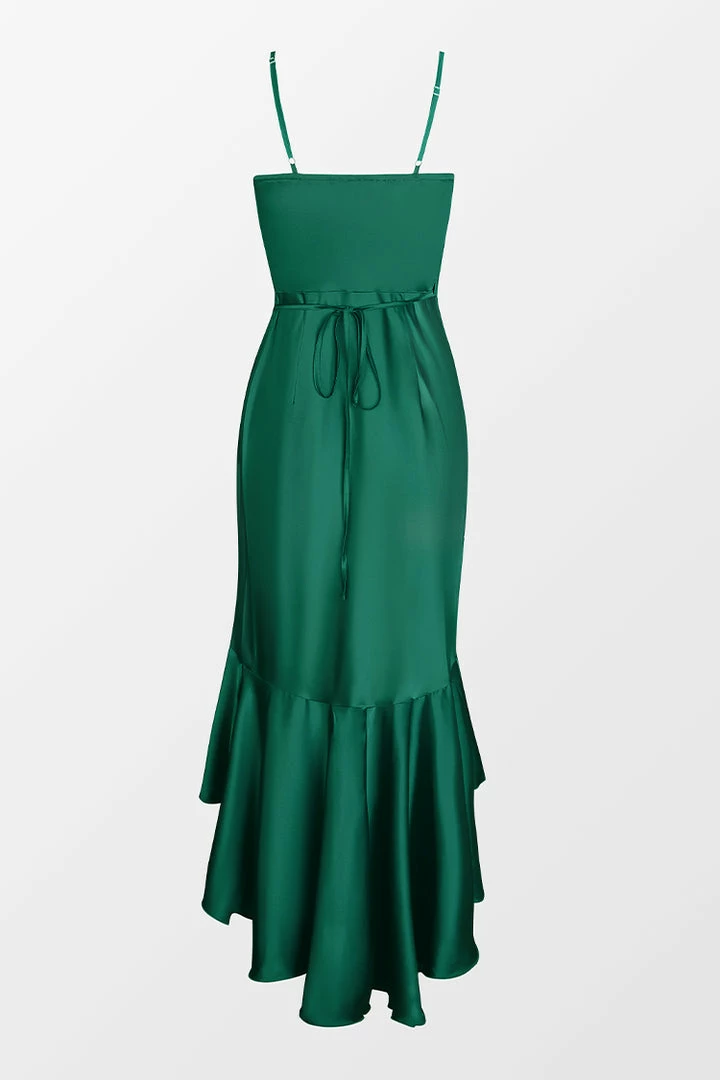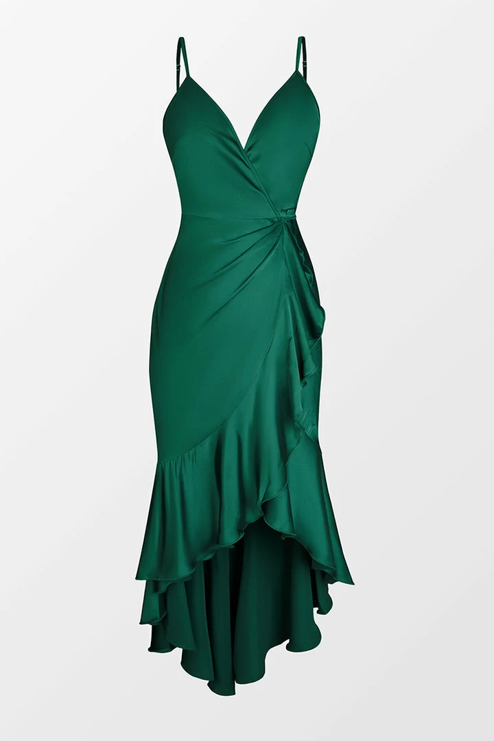 Forever be THAT girl in our Holidaze Satin Flounce Wrap Dress featuring a surplice neckline, self-tie sash belt, wrap design, high-low flounce hem, and adjustable cami straps.ย