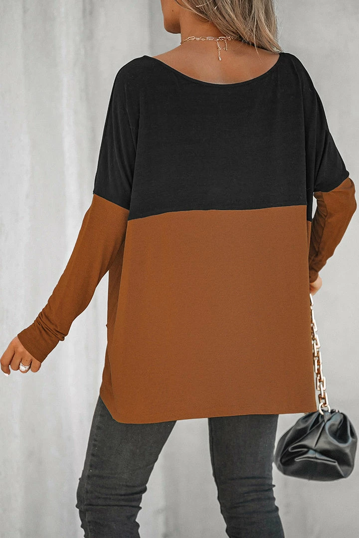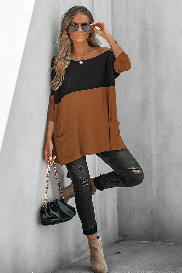 The best part of a chilly fall morning is putting on this stylish and warm tee featuring a colorblock design, round neckline, long sleeves, front patch pockets, and an oversized fit .ย