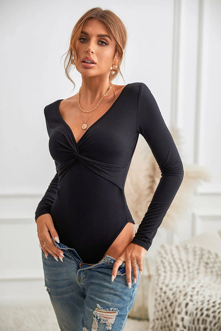 You can never go wrong with a classic black bodysuit! Featuring a V-neckline, long sleeves, and a form-fitting silhouette.Β