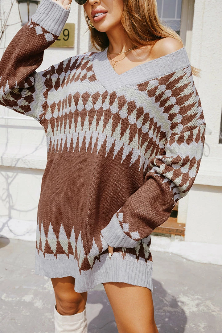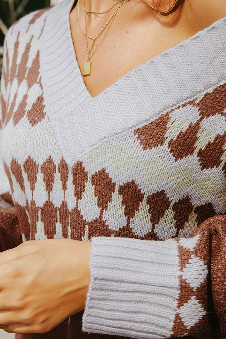 Cozy looks good on you babe, and youโll be comfy yet chic in this sweater dress featuring an argyle pattern, V-neckline, dropped long sleeves, ribbed trim, and a mini hem.ย