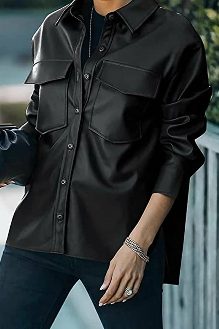 Edgy and sexy, this faux leather jacket is everything you need! It features a basic collar, chest flap pockets, button-front closures, and long sleeves.ย