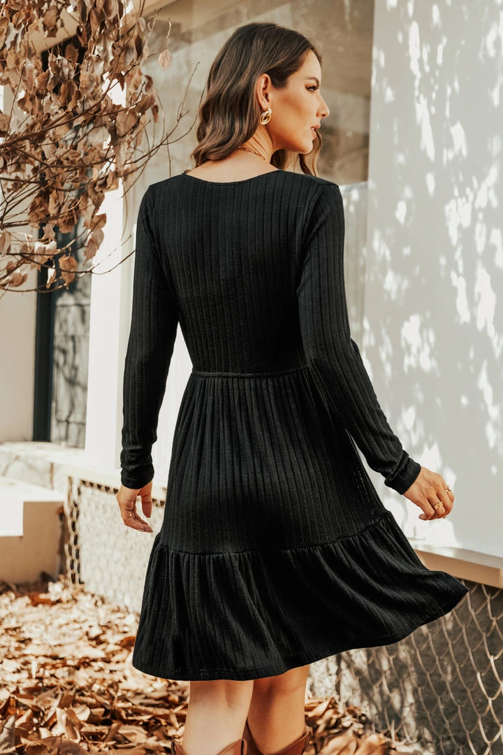 Everyone needs a cute and soft dress for the fall season! Crafted from ribbed knit and featuring a V-neckline, elasticized waist, long sleeves, a mini hem, and A-line silhouette.