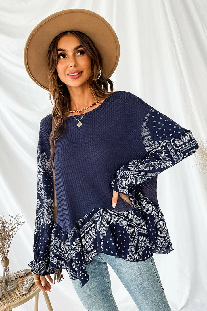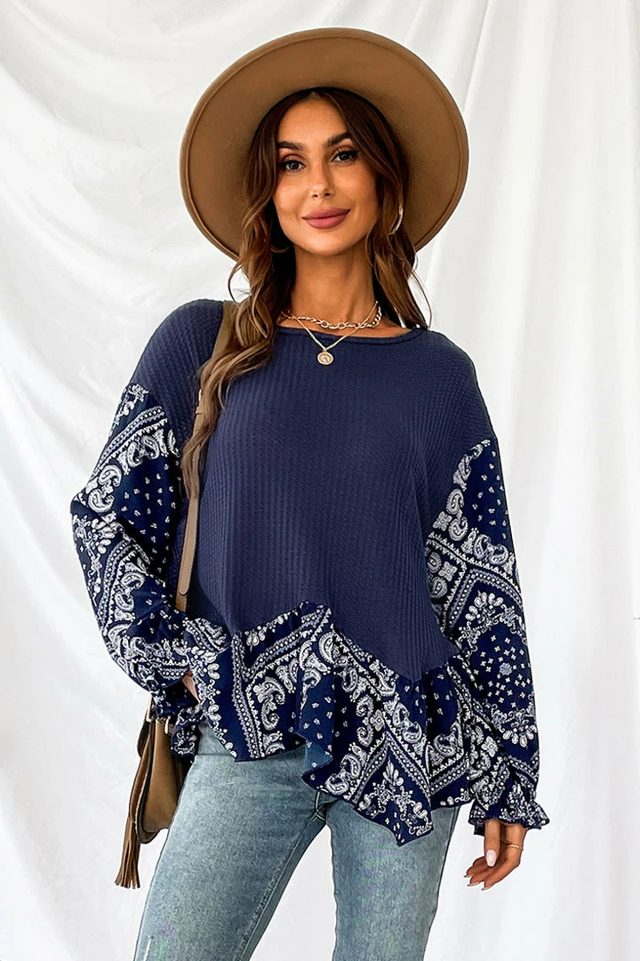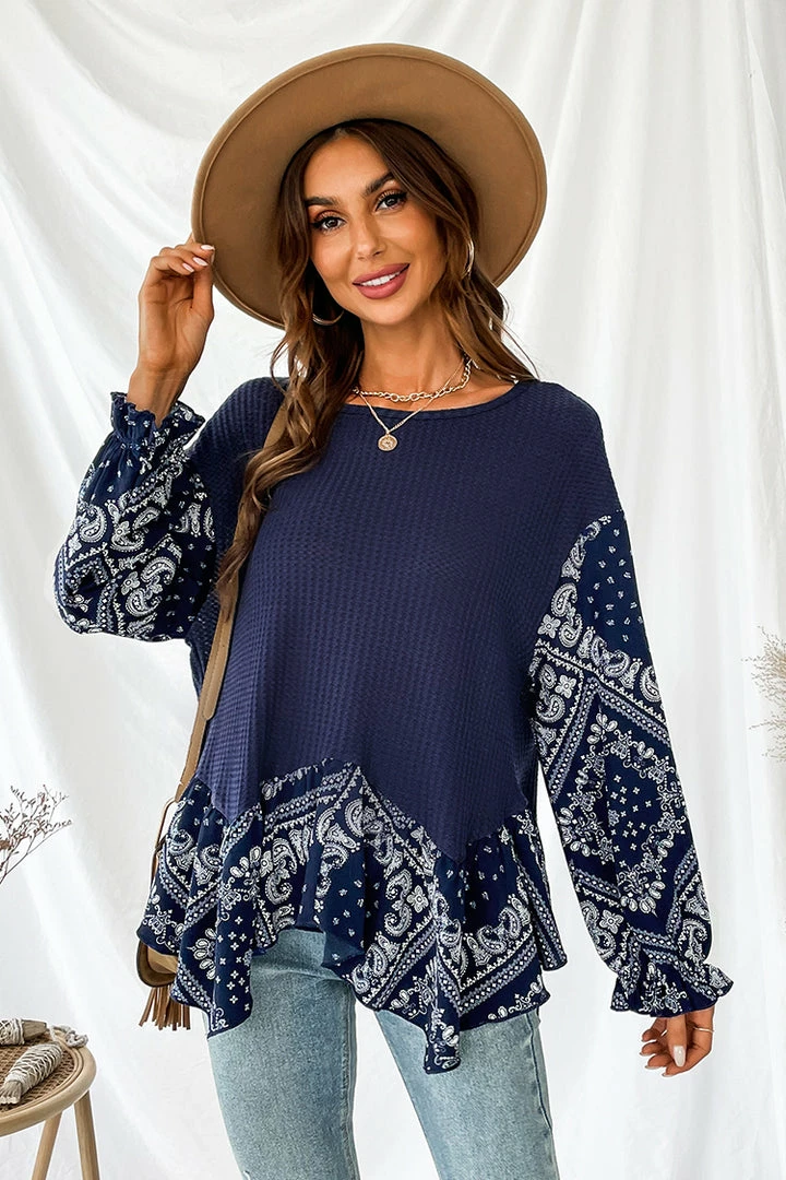 Comfy and fun, this top is everything you need to change up your closet! Constructed from both waffle knit and woven material, it features a partial paisley print, dropped shoulders, long peasant sleeves, and flounce trim.