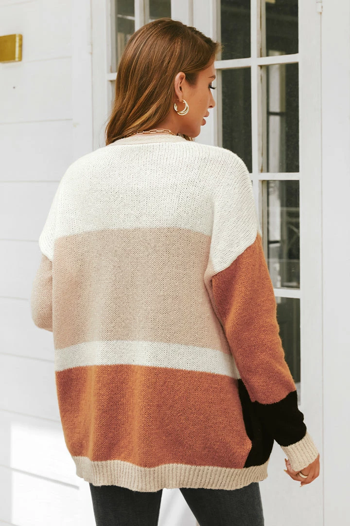 Head to the pumpkin patch this fall in this adorable cardigan featuring a colorblock design, V-neckline, dropped long sleeves, button-front closures, and ribbed trim.