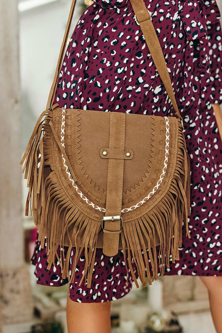 We are getting major 70โs vibes from this faux suede crossbody bag featuring a flap top with buckle closure, adjustable shoulder strap, and fringe trim.