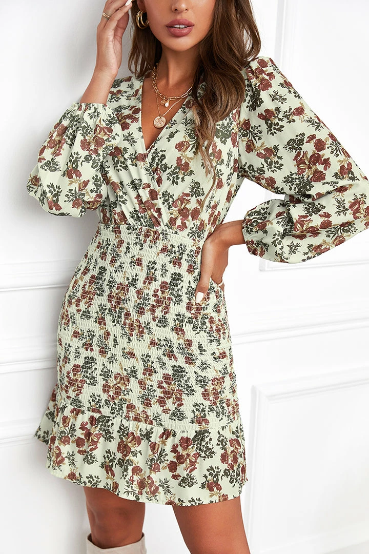 Hang out with your besties in this mini dress featuring a floral print, surplice neckline, smocked construction, long peasant sleeves, and a flounce hem.