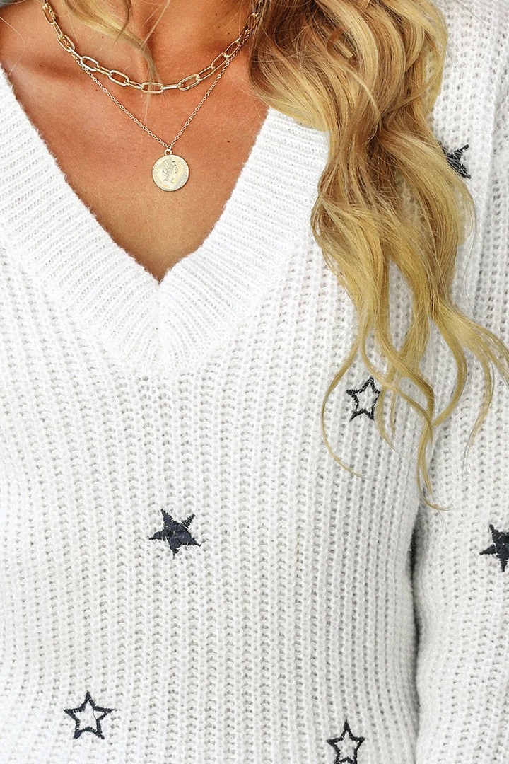 Shine like the star you are in this purl knit sweater featuring allover star embroidery, dropped long sleeves, ribbed trim, and a V-neckline.