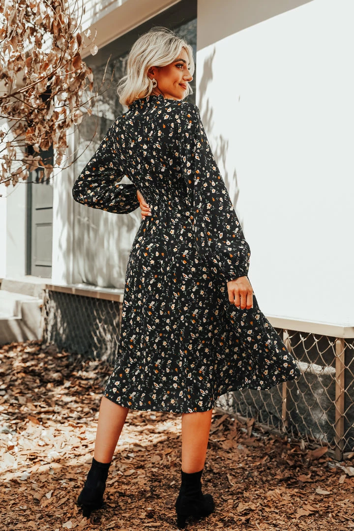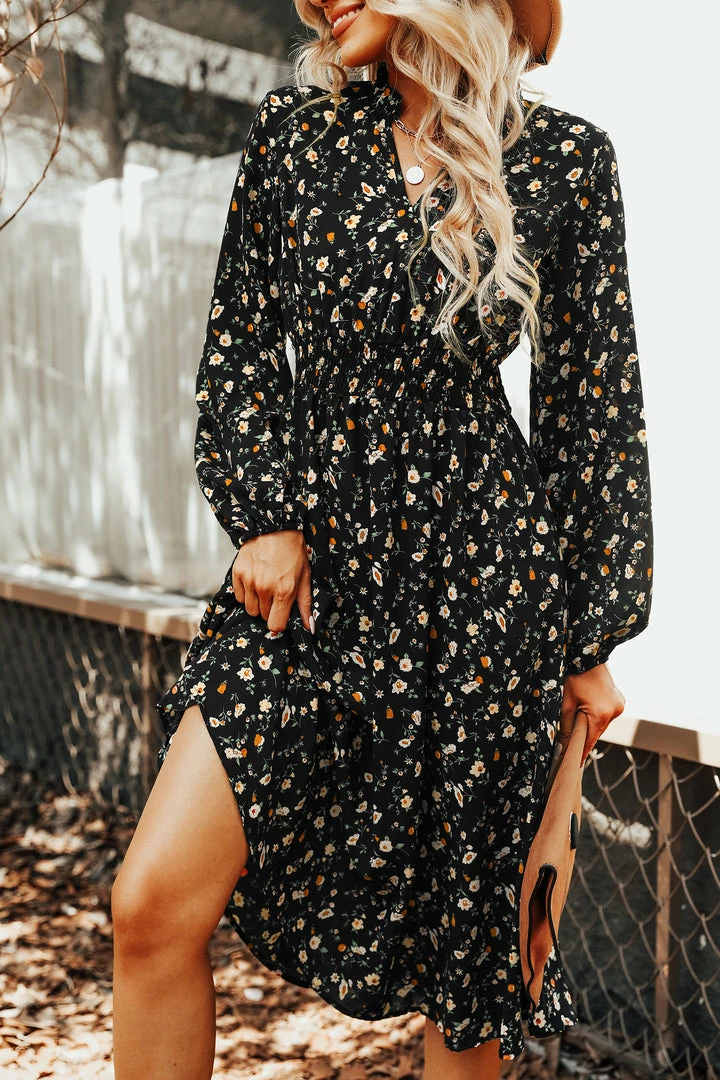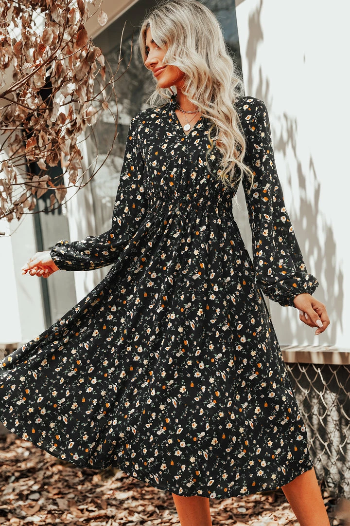 We are getting major boho vibes from this woven midi dress featuring an allover ditsy floral print, V-neckline, smocked waist, long peasant sleeves, and an A-line silhouette.
