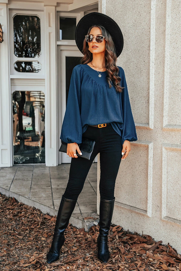 Every closet needs an elevated staple and this top is just that! Featuring a round neckline, ruching around the yoke, long peasant sleeves, and a relaxed fit.
