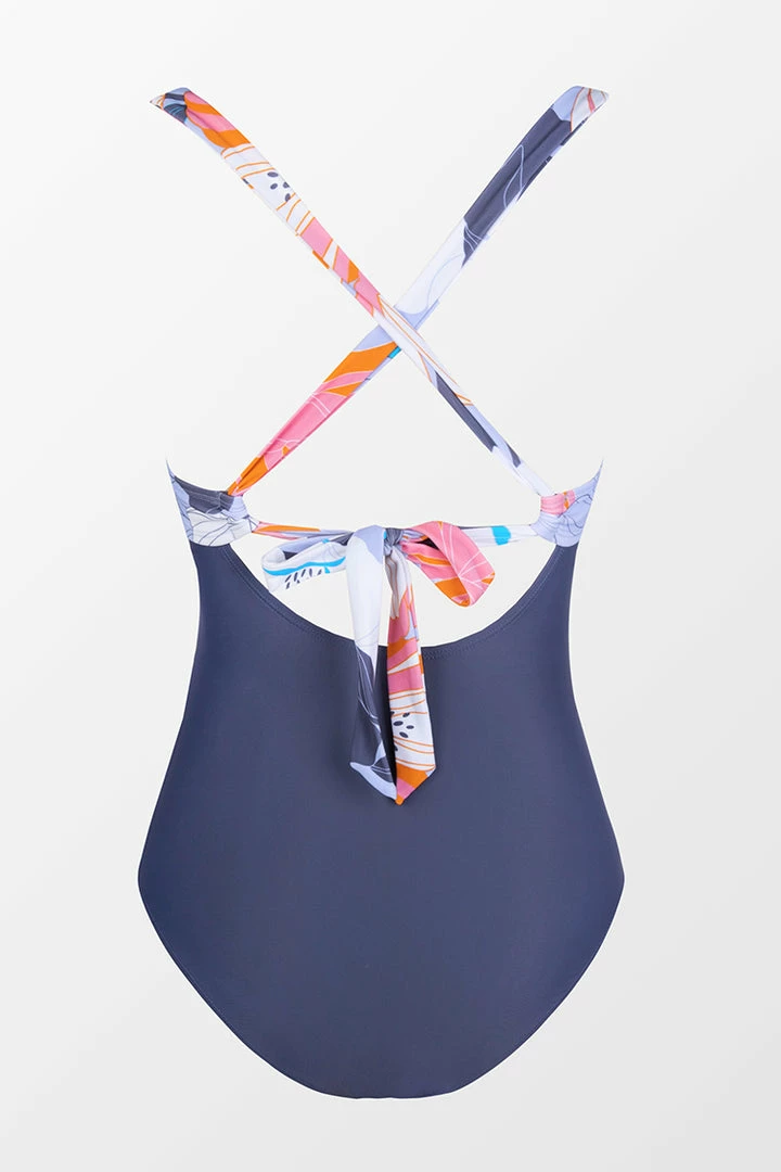 You’re sure to stand out in the pool or on the deck in this one piece swimsuit. It features a wrap front, center cutout, and contrasting floral print that gives it a sophisticated look.