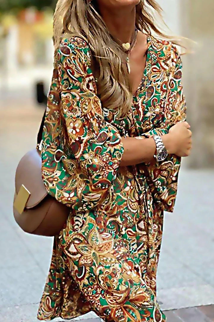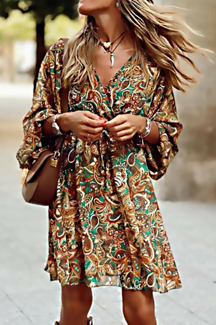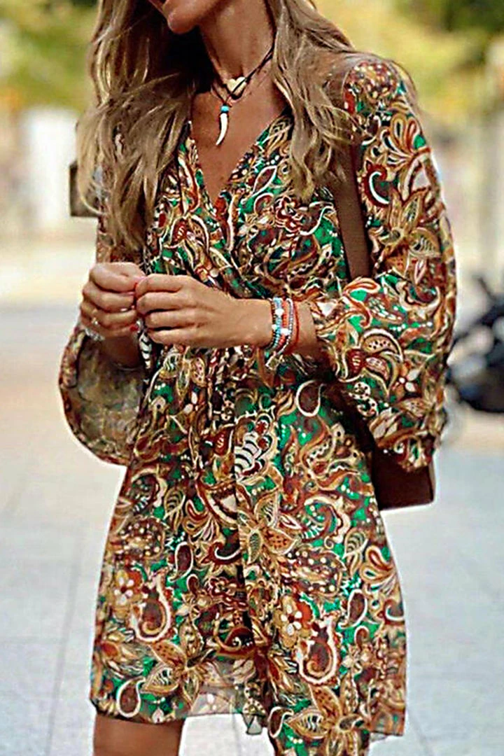 We are getting major 70βs vibe front this boho dress featuring an allover paisley print, surplice neckline, elasticized waist, ΒΎ flared sleeves, a mini hem, and A-line silhouette.