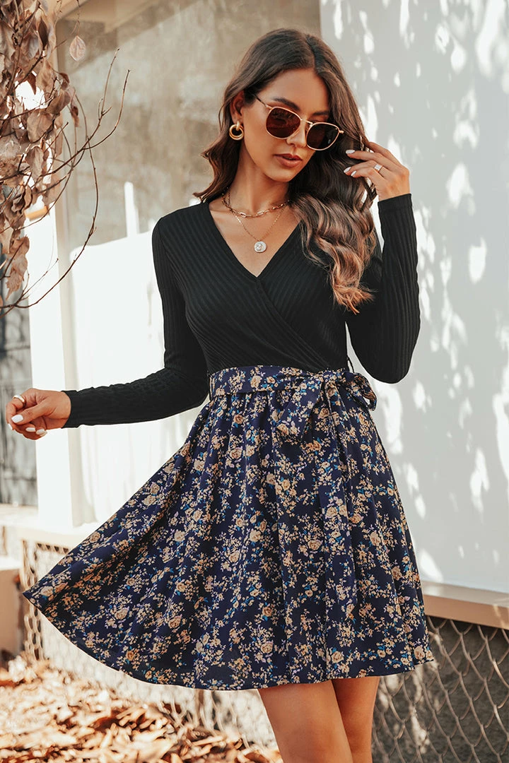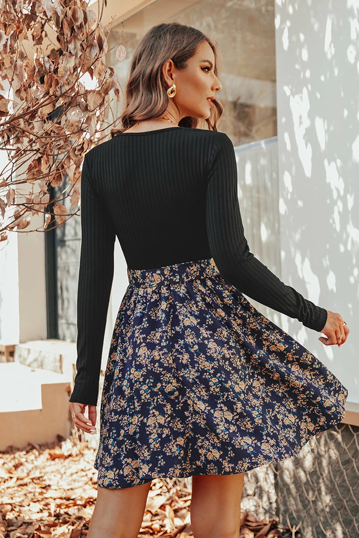 Grab your besties and head to brunch in this knit mini dress featuring a partial ditsy floral print, square neck, elasticized waist, long sleeves, and an A-line silhouette.