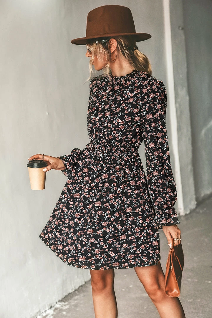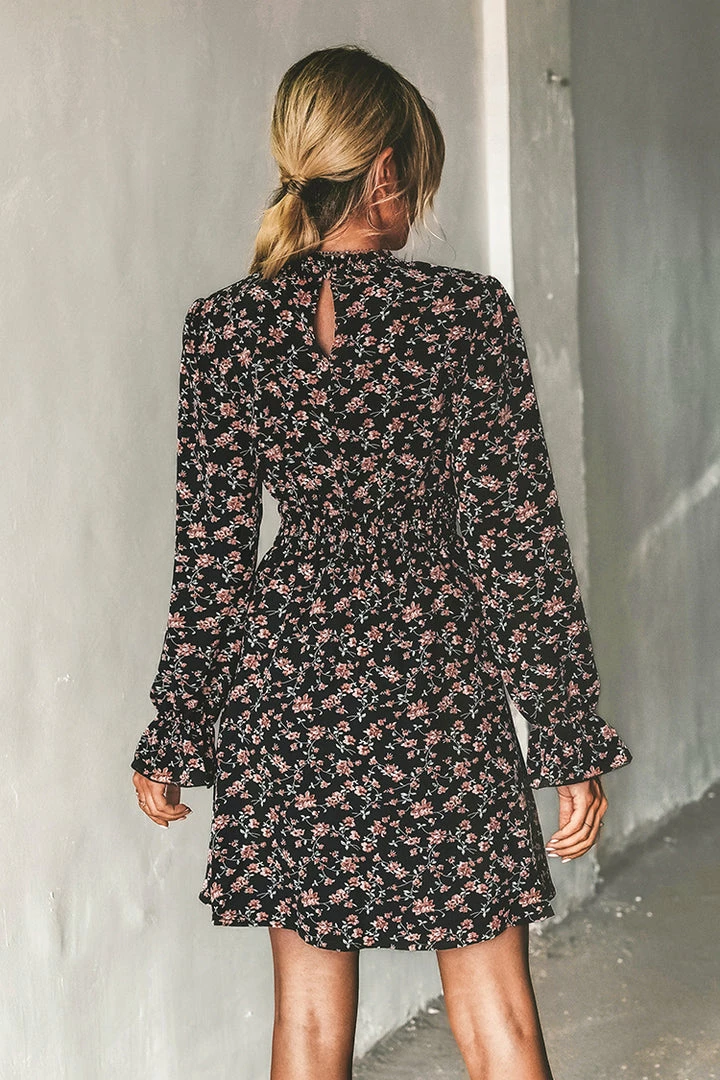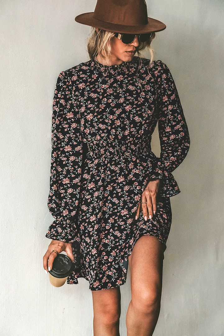 Go to brunch with your girls in style in this mini dress featuring a ditsy floral print, round neckline, long trumpet sleeves with flounce cuffs, smocked trim, and an A-line silhouette.