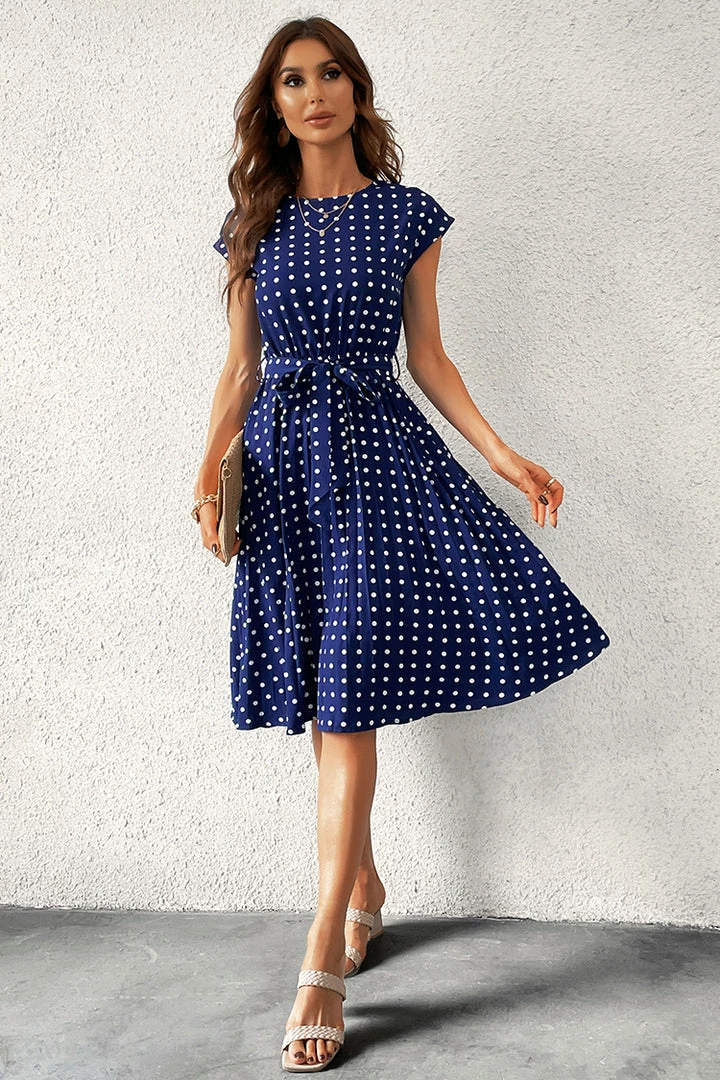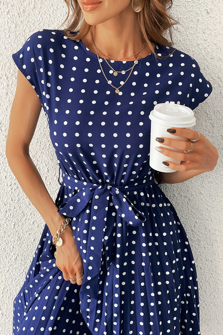 Our Round Neck Dots A-shape Dress features with belted and pleated design and mid length. Style with heels and accessories for a look we’re crushing on this season.