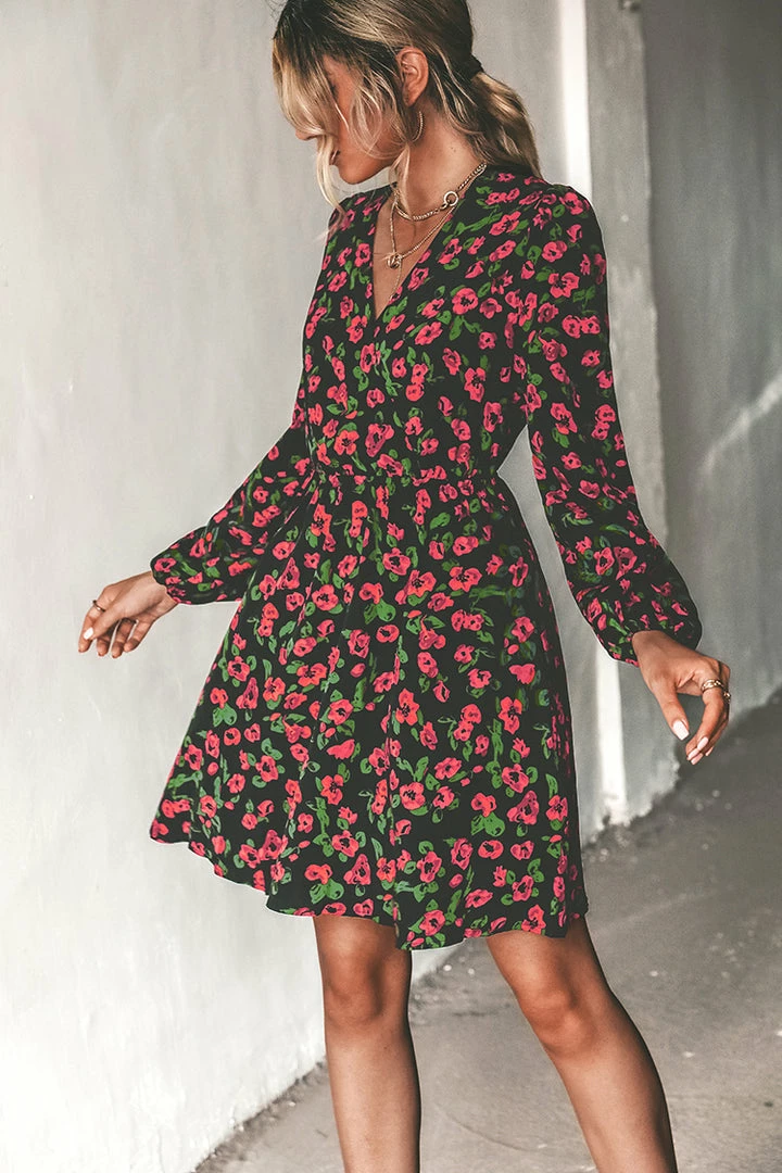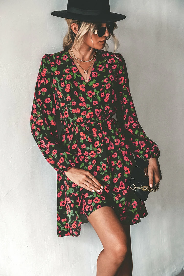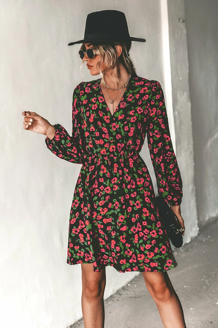 Go to brunch with the girls in this mini dress featuring an allover floral print, mock wrap design, surplice neckline, long peasant sleeves, and a fit and flare silhouette.