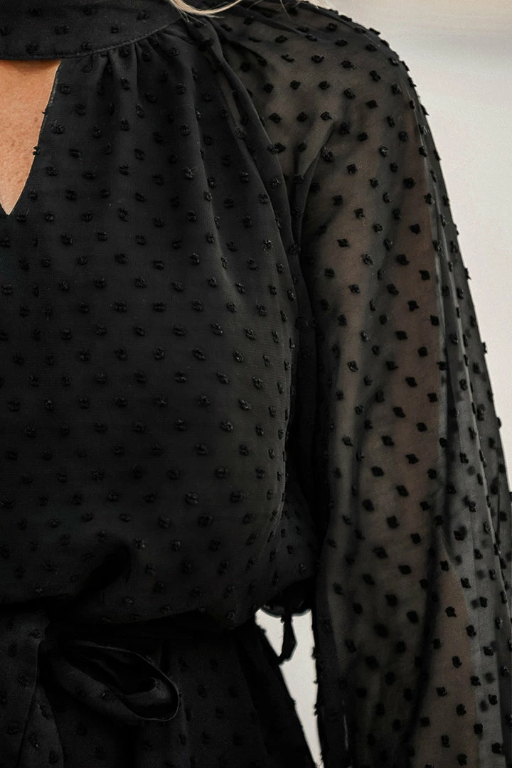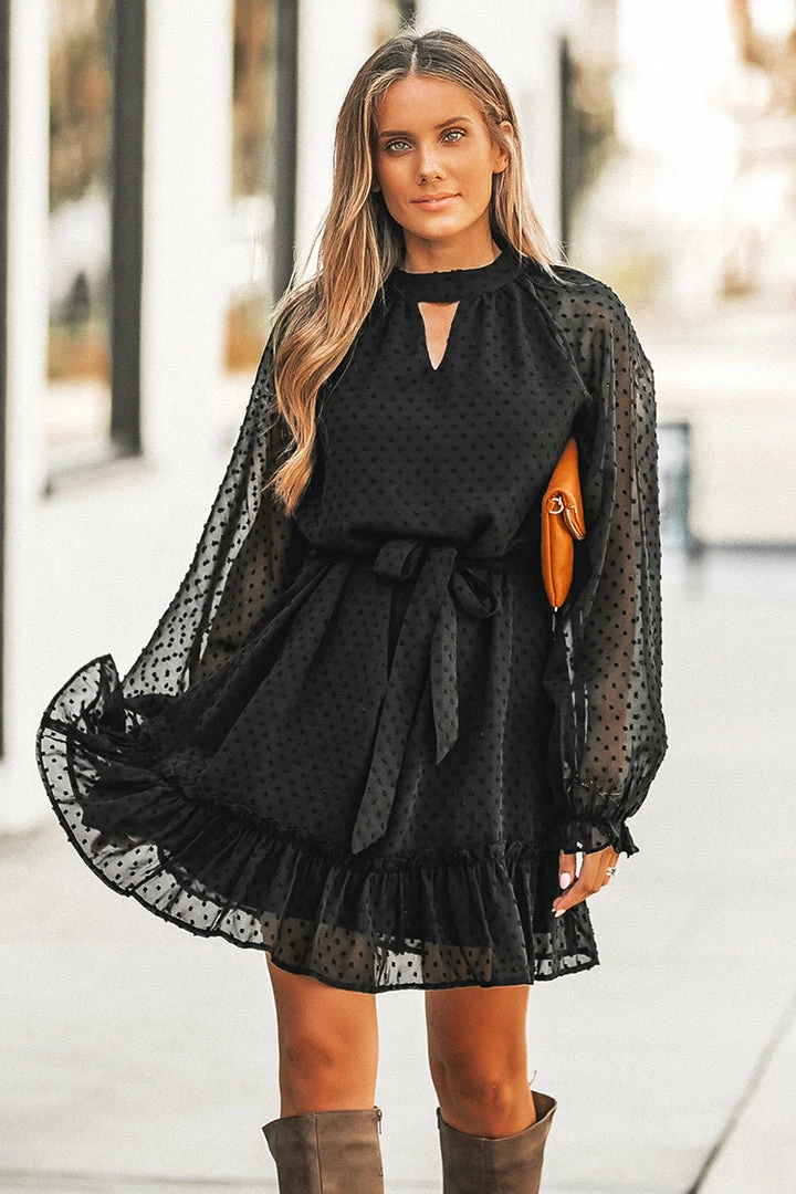 Everyone needs a little black dress in their closet! Crafted from chiffon and featuring a clip dot design, high neckline, front cutout, self-tie sash belt, long peasant sleeves, ruffled trim, a mini hem, and A-line silhouette.