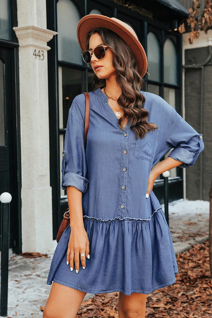Cute yet casual, this denim mini dress is everything you need! Featuring a split neckline, collar, patch pocket, button-front closures, long roll-tab sleeves, drop-waist silhouette with ruffled trim, and an A-line silhouette.