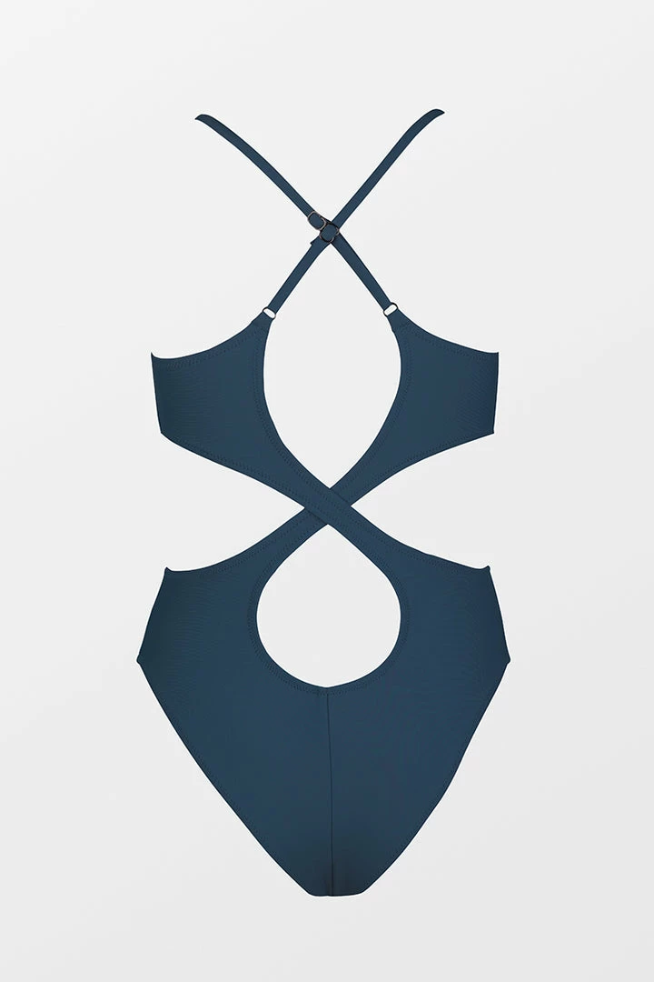 Make a sexy statement in this one-piece swimsuit featuring a plunging V-neckline, adjustable cami straps that lead to a crisscross back forming cutouts, and cheeky bum coverage for an alluring edge.