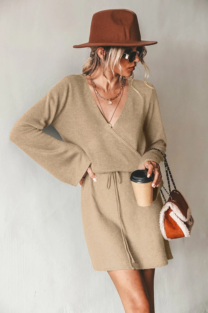 You and this sweater dress are going to be a perfect pair! Featuring a surplice neckline, drawstring waist, long flared sleeves, and a mini hem.