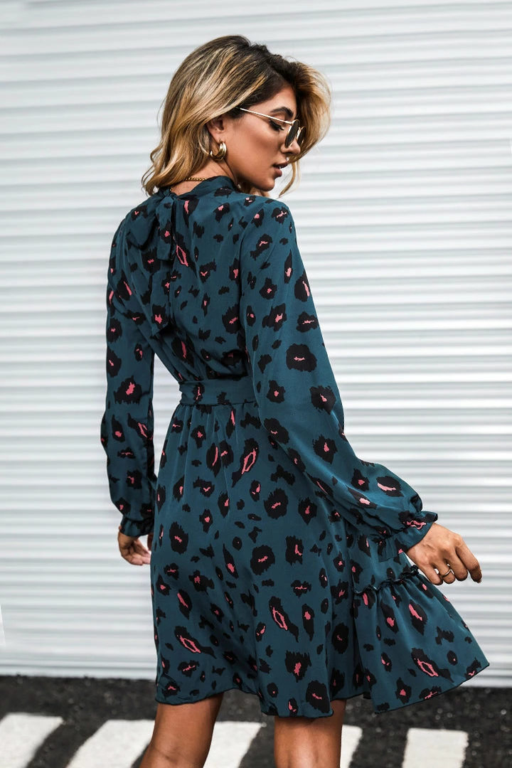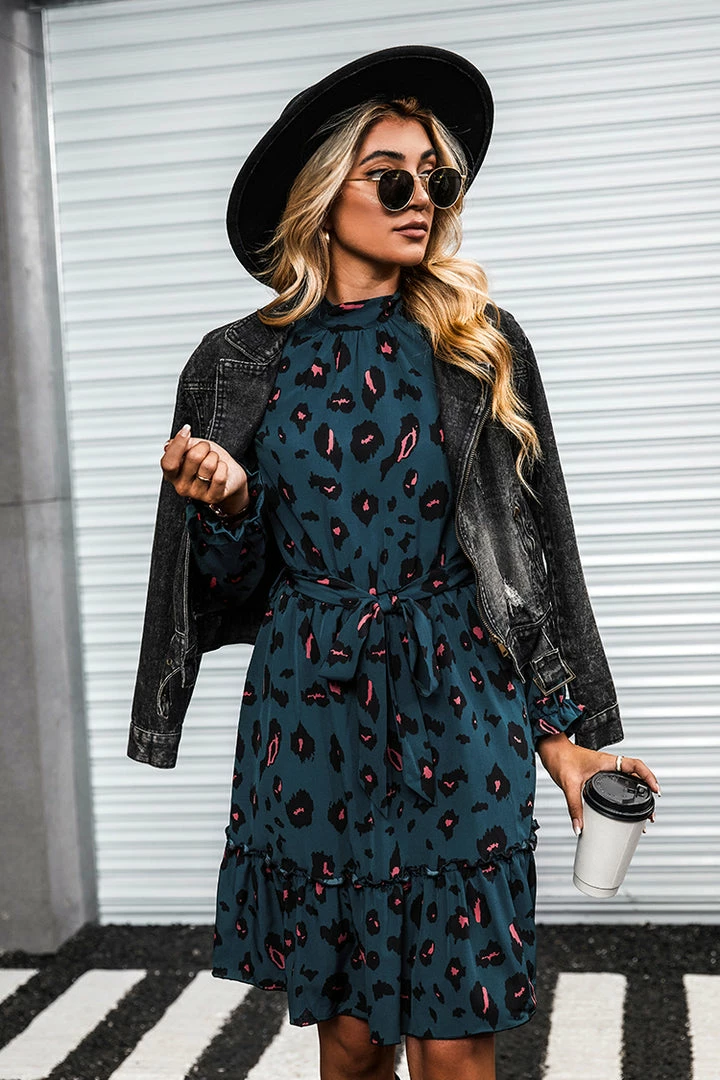 Make a statement in this mini dress featuring an allover leopard print, mock neck, self-tie sash belt, long trumpet sleeves, and flounce trim.Β