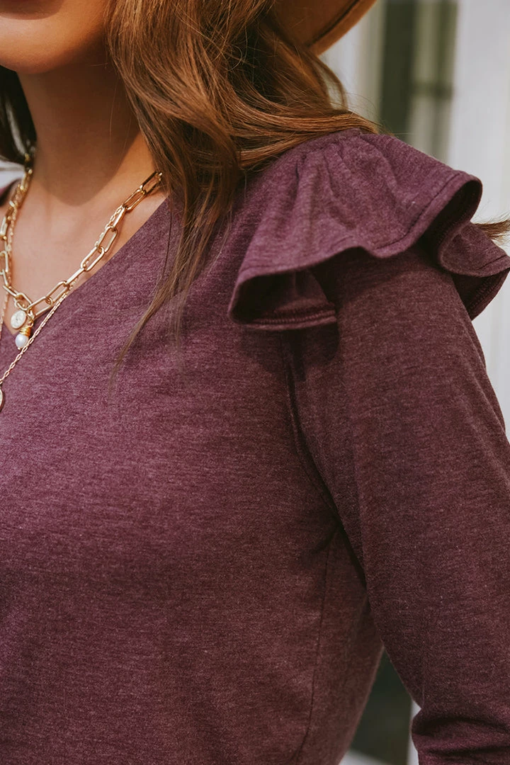 Itβs getting chilly, better grab this marled knit tee featuring a V-neckline, long sleeves, and ruffled details on the shoulders.