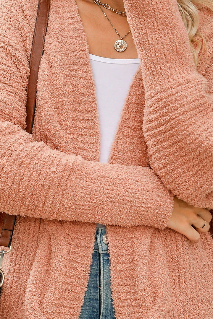 Layer up in the cold weather with this adorable chinlon knit cardigan featuring an open front, dropped long sleeves, ribbed trim, and a relaxed fit.