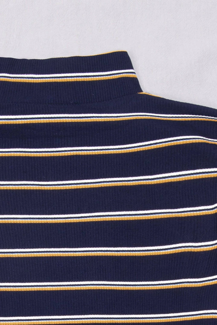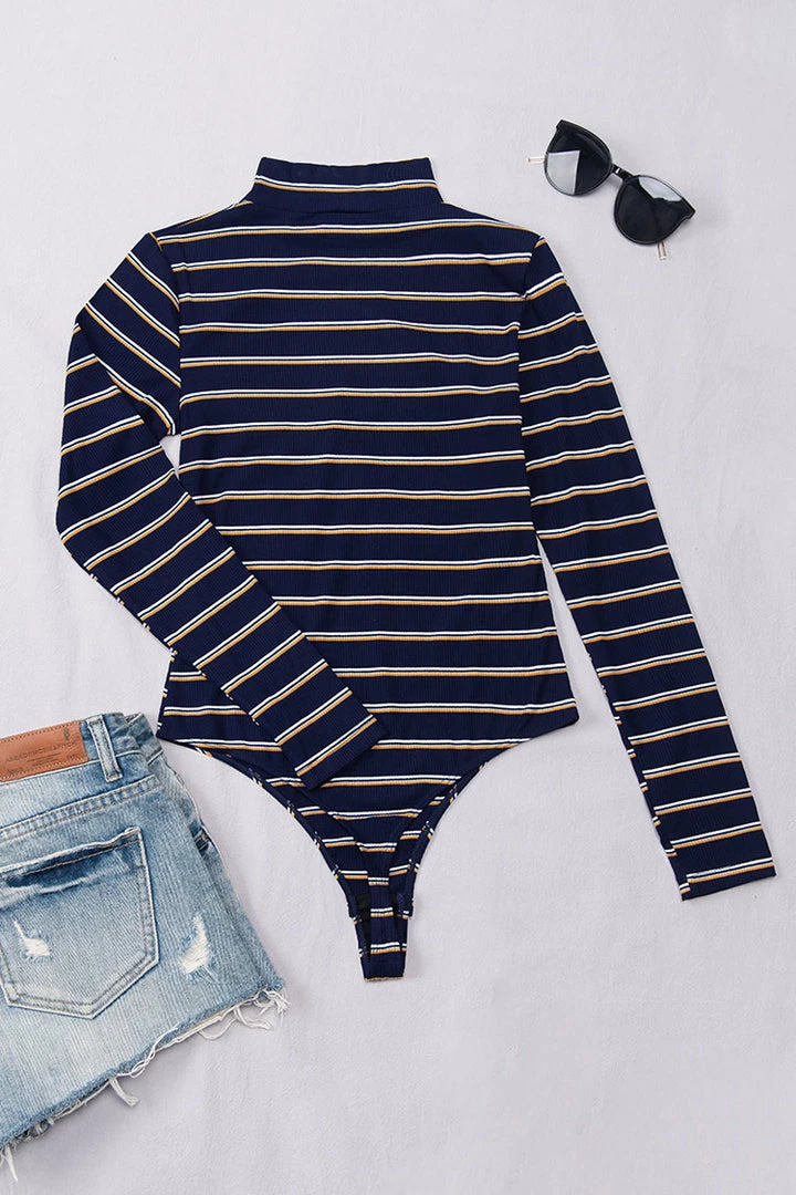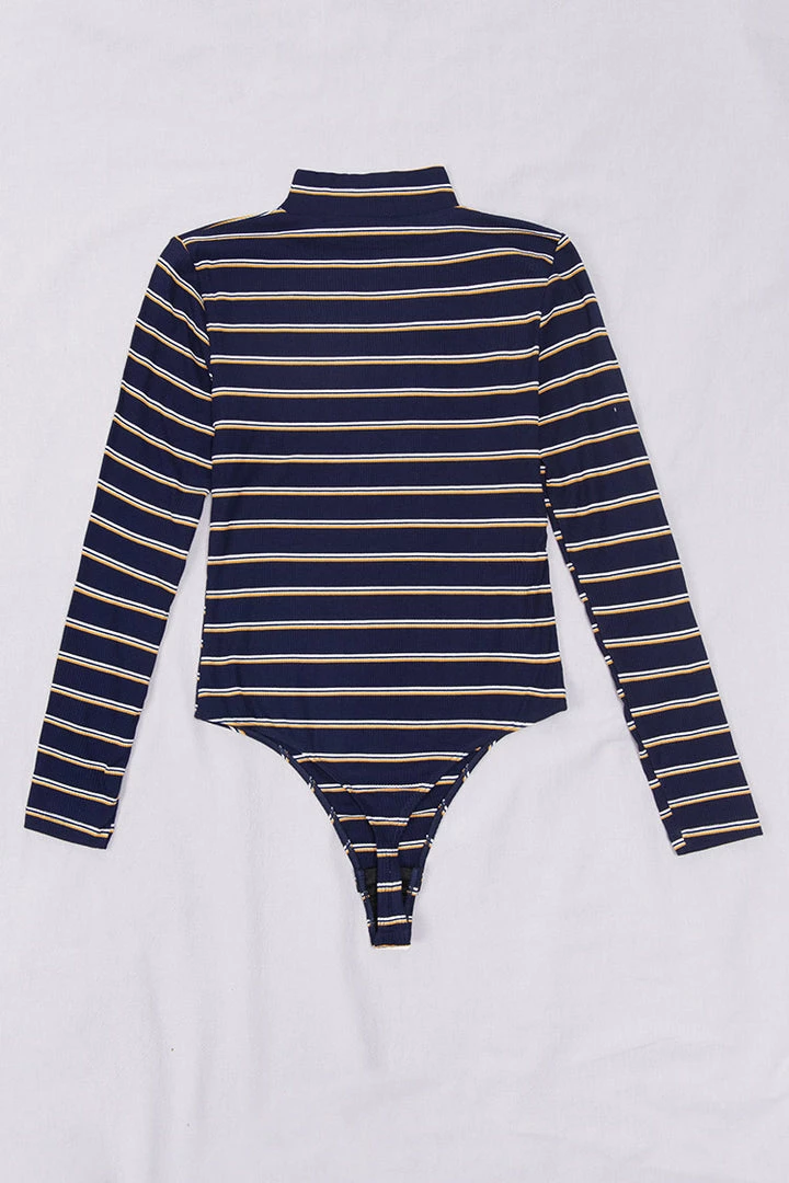 This Gemma Striped High Neck Bodysuit looks great with anything. Featuring a body shaping fit and a monochrome stripe material, style with jeans and black boots for an ultimate effortless chic look.