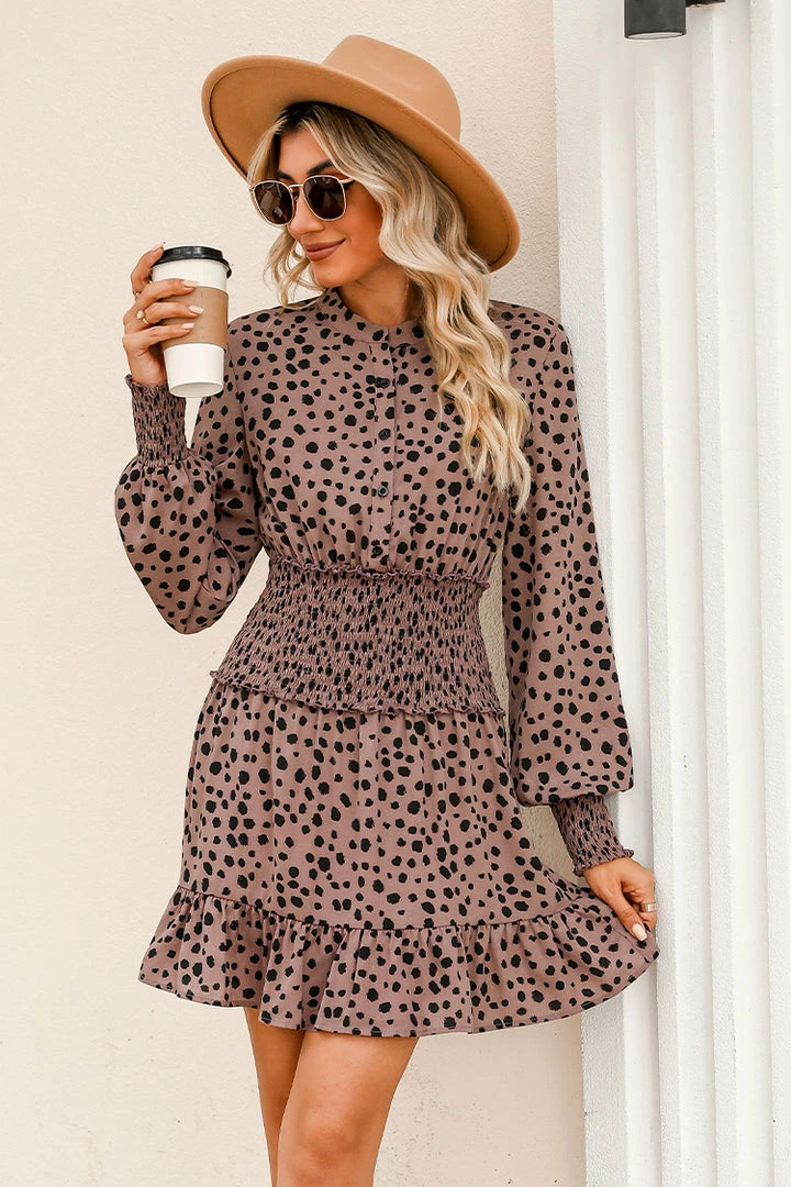 Make a statement in this woven mini dress featuring a cheetah print, high neckline, smocked waist and cuffs, button-front closures, long peasant sleeves, and a flounce hem.