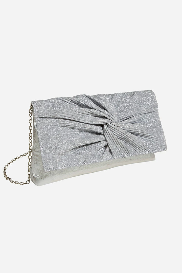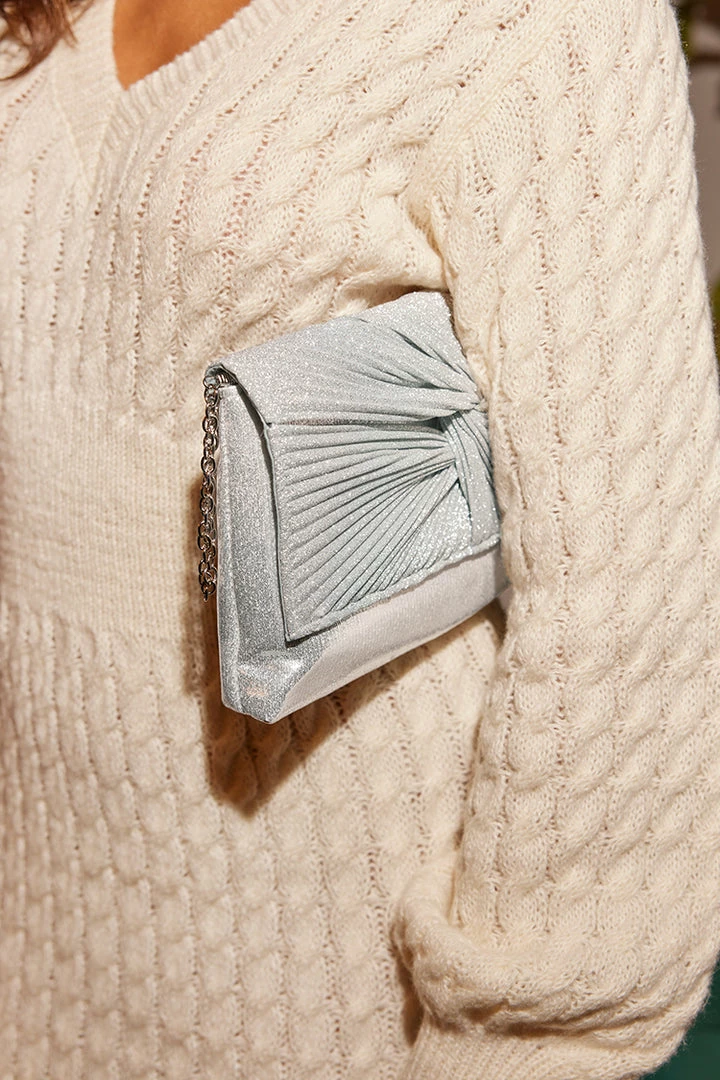 No party outfit is complete without our Glittered Twist-Front Crossbody Bag! Crafted from glitter knit and featuring a twist-front design on the flap front, high-polish hardware, and a rolo chain shoulder strap.