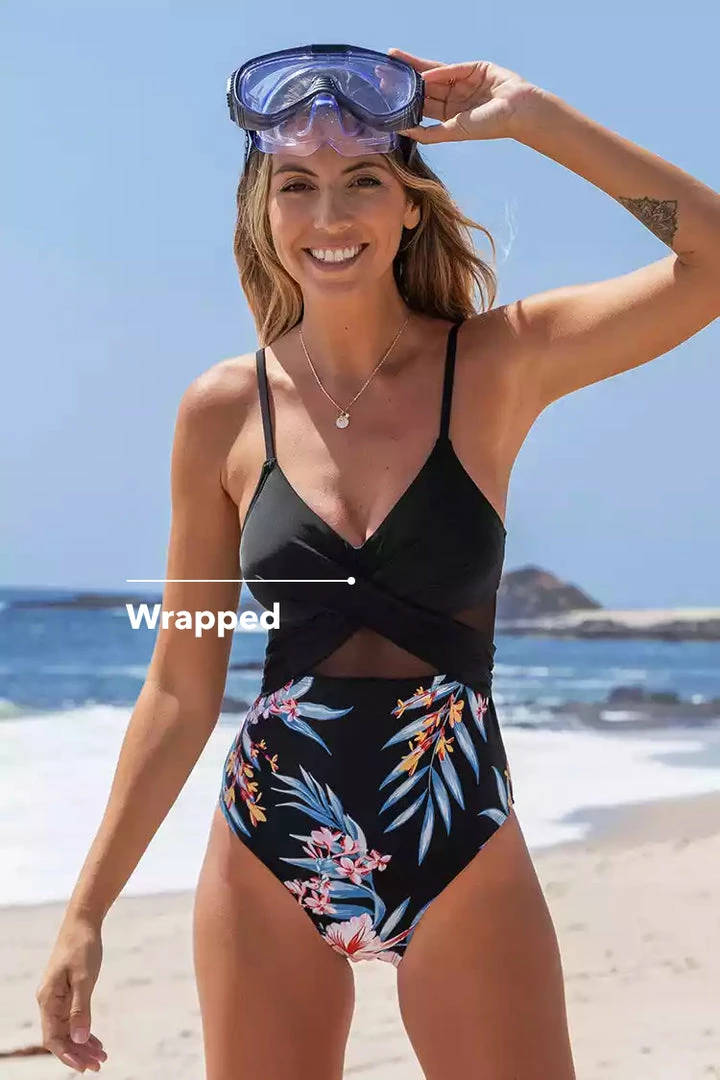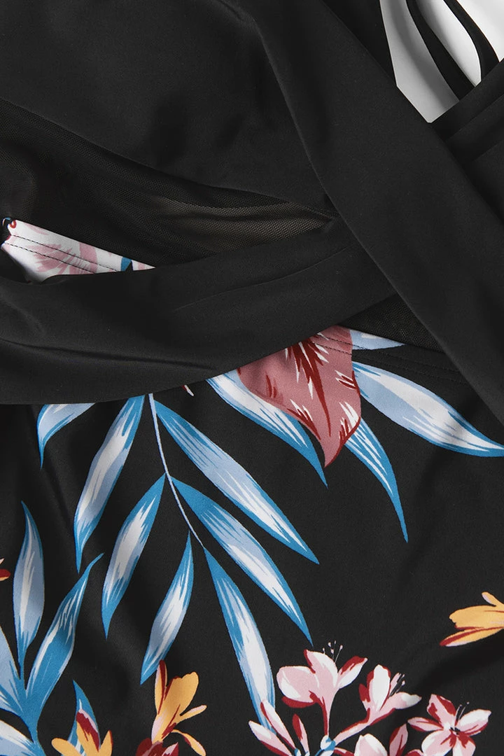 You wonβt want to miss out on this super-flattering one piece swimsuit. In black with a contrasting floral print, this swimsuit features a wrap front design for support and comfort, while the mesh insert and cutout back add visual interest.