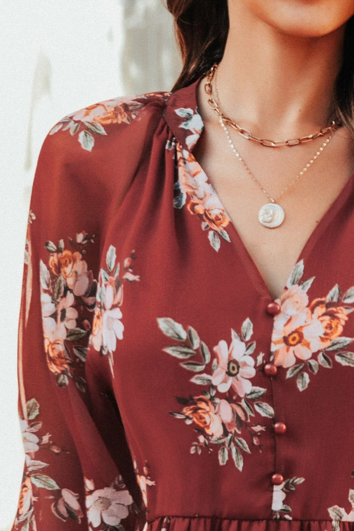 We are getting major romantic vibes from this chiffon mini dress featuring a floral print, V-neckline, elasticized waist, button-loop front closures, semi-sheer long peasant sleeves, an A-line silhouette, and ruffled hem.