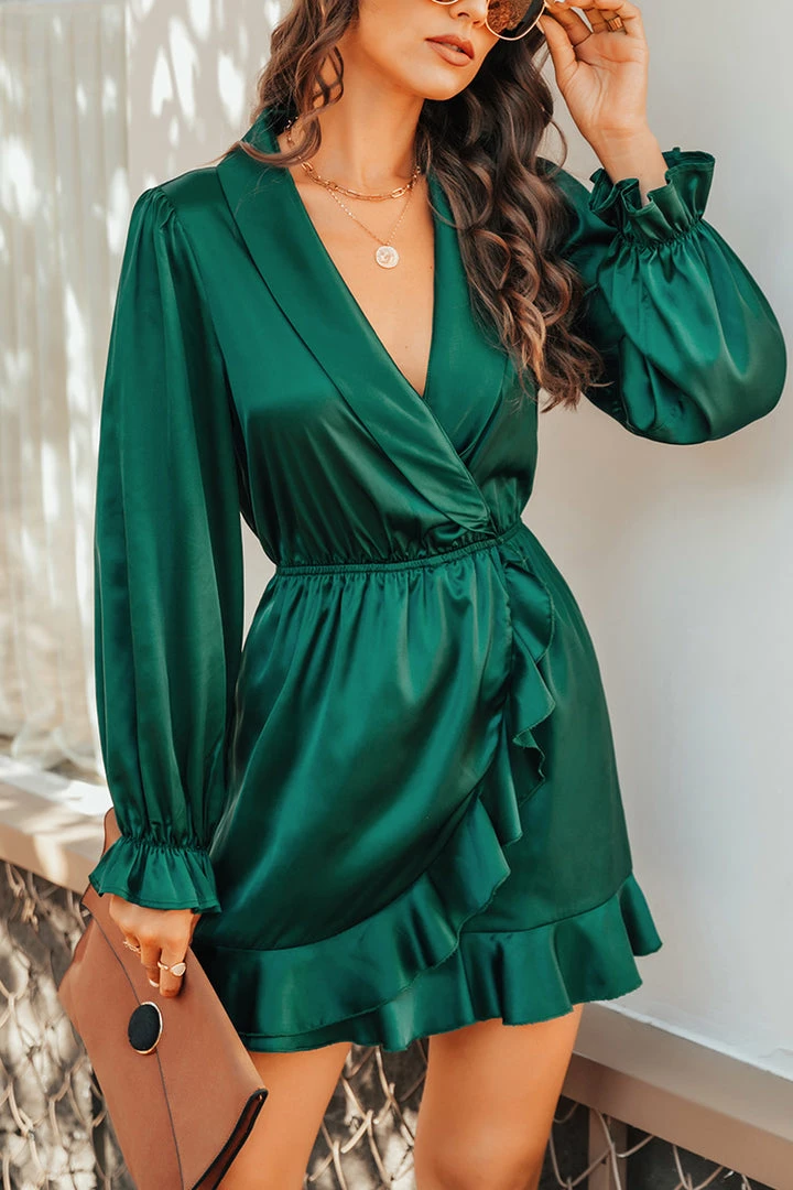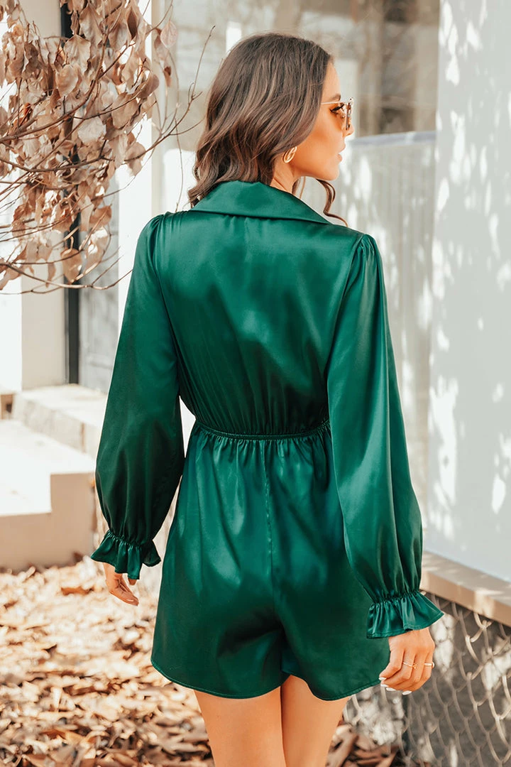 Turn heads all night long in this satin romper featuring a wrap design, surplice neckline, foldover collar, long trumpet sleeves, flounce trim, and a tulip hem.