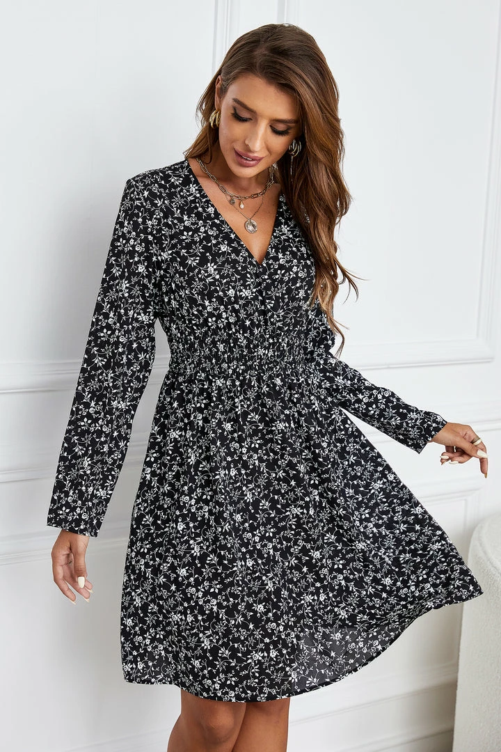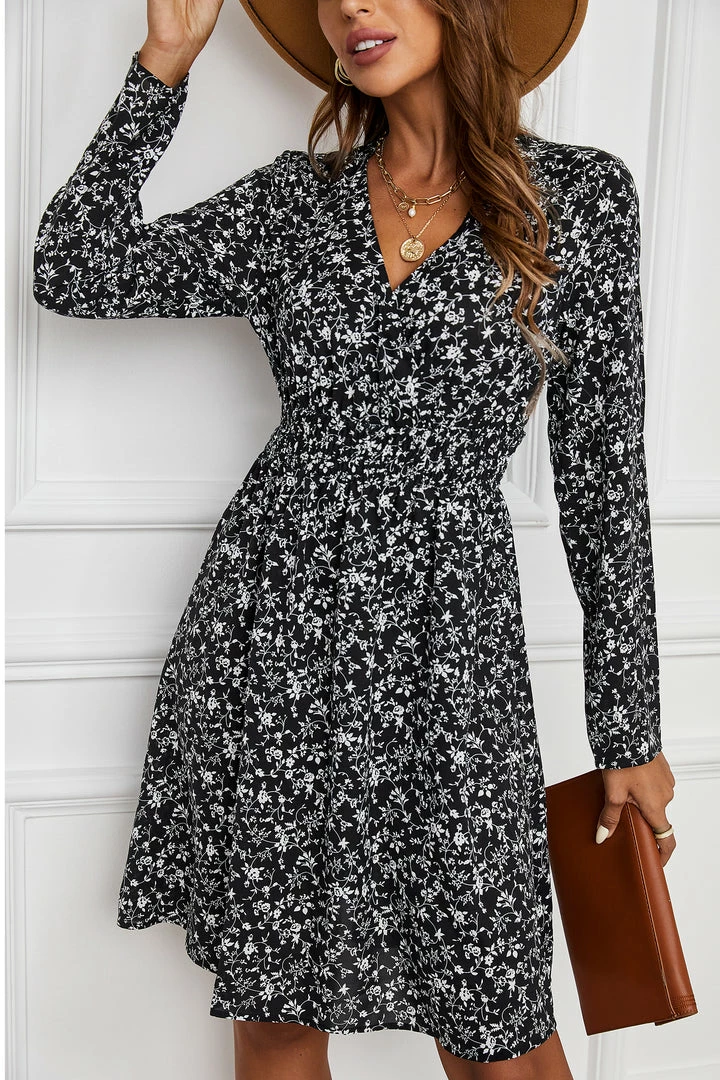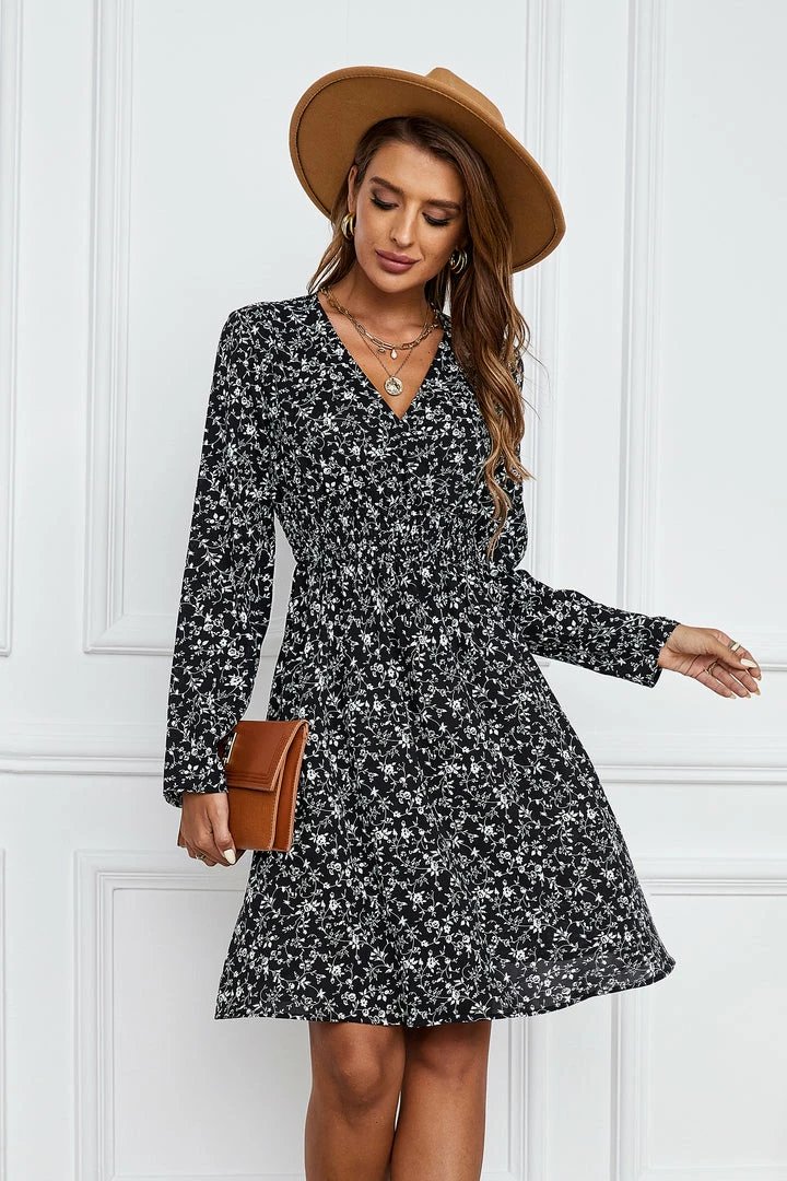 Head to brunch in style in this mini dress featuring a ditsy floral print, V-neckline, smocked waist, long sleeves, and an A-line silhouette.