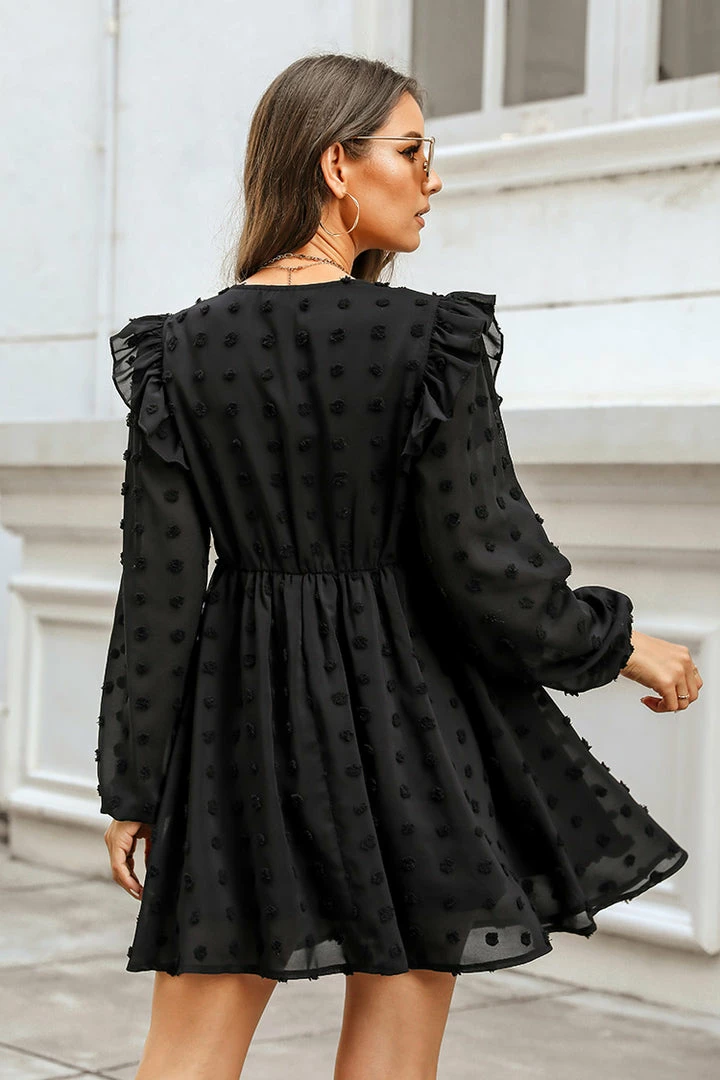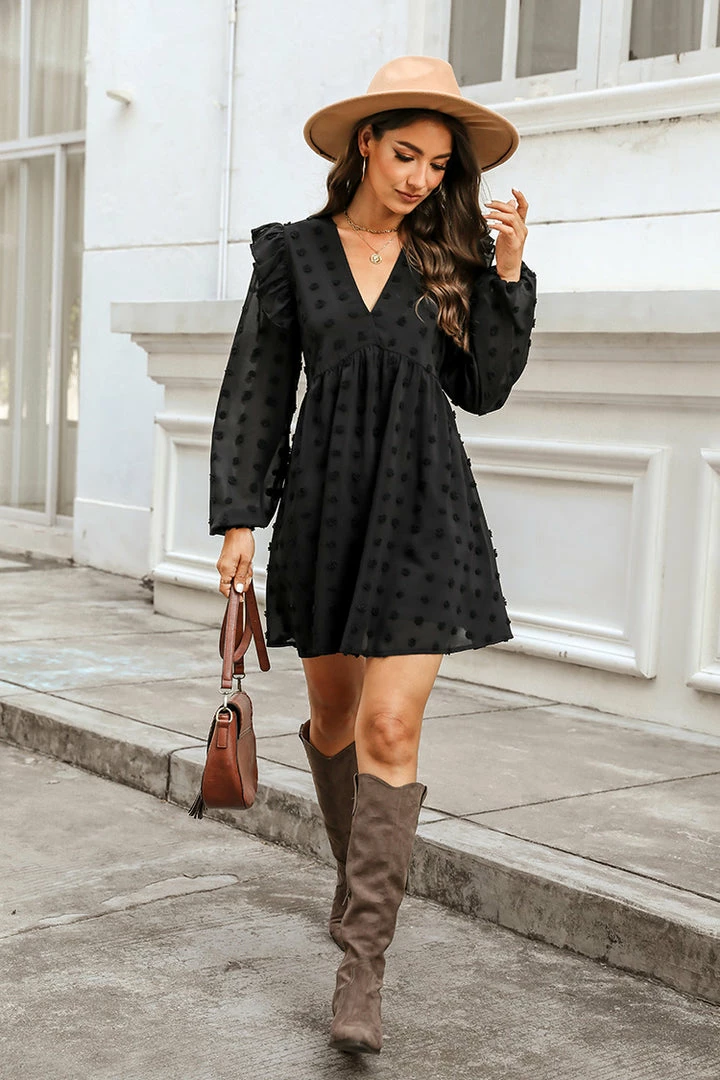 This woven mini dress is giving main character energy! Featuring an allover clip dot design, V-neckline, empire waist, ruffles on the long peasant sleeves, and an A-line silhouette.