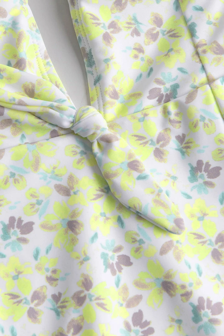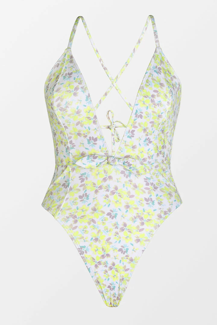 This sleek one piece swimsuit is equal parts sweet and sassy with its plunging neckline, dainty floral print, and tie front.