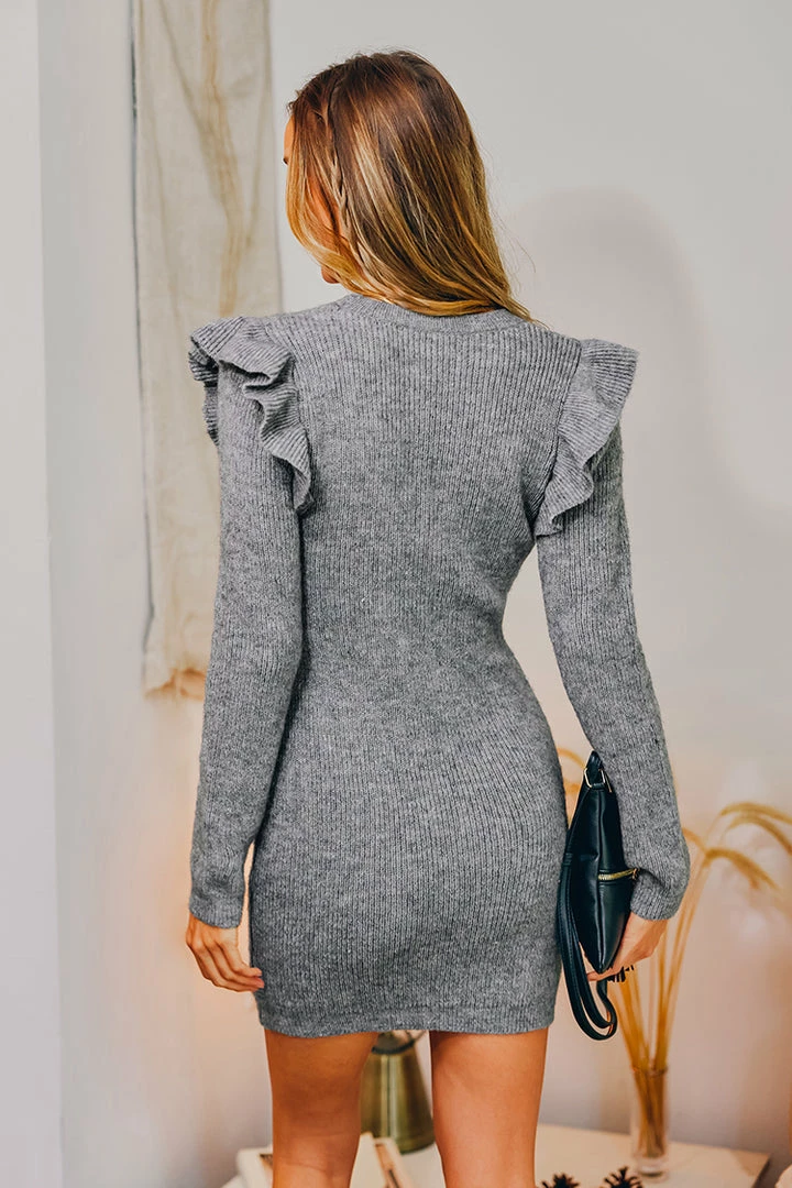 Youโll be head over heels for this ribbed knit sweater dress featuring a round neckline, ruffles on the shoulders, long sleeves, a mini hem, and bodycon silhouette.